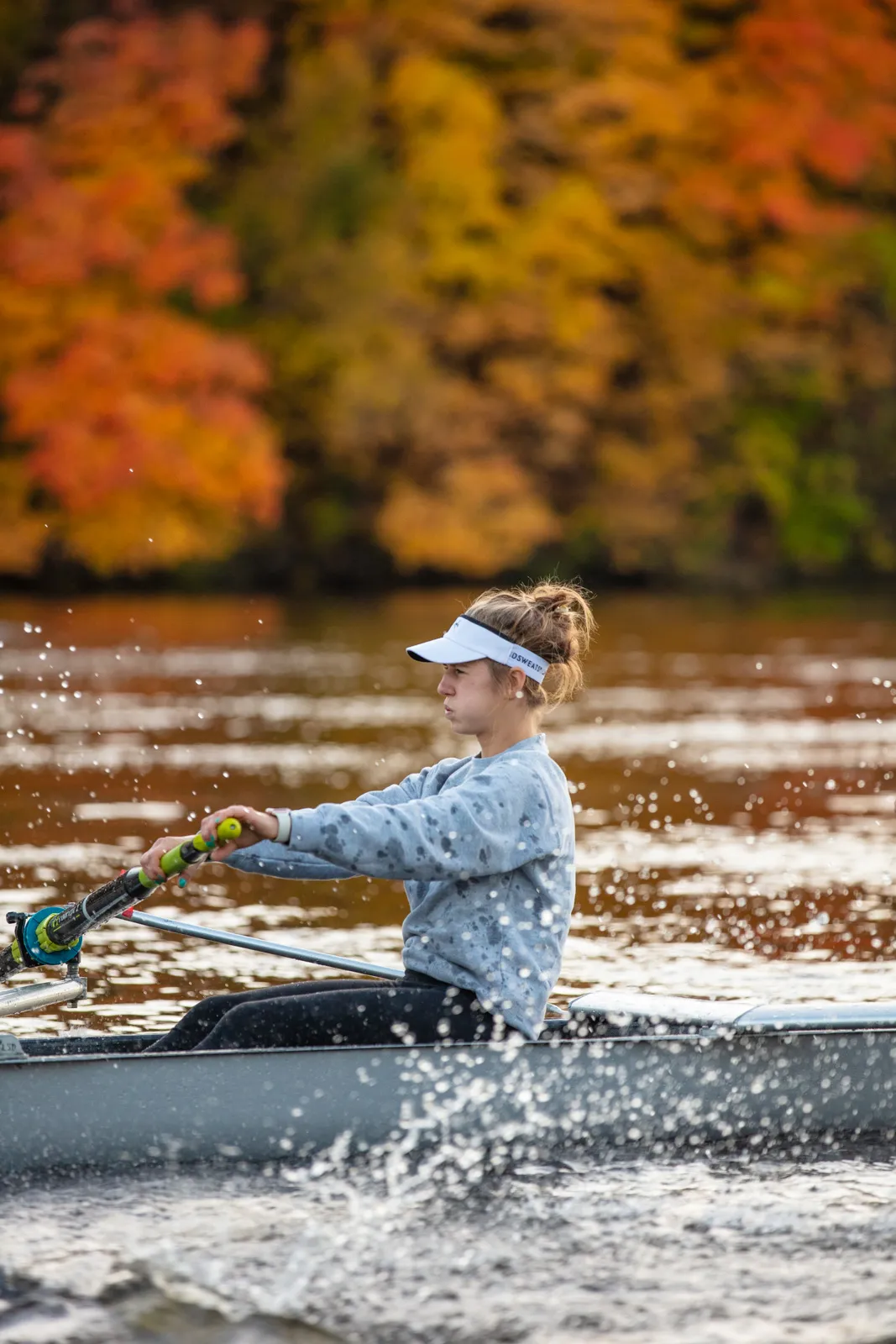 A member of the crew club rows on the Mississippi with a backdrop of fall leaves along the riverbank.