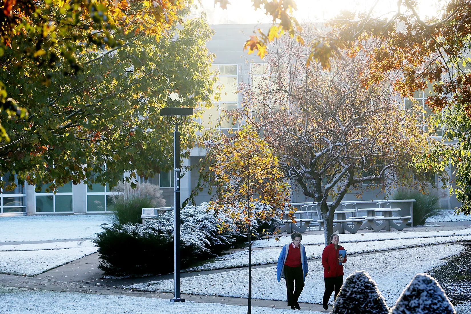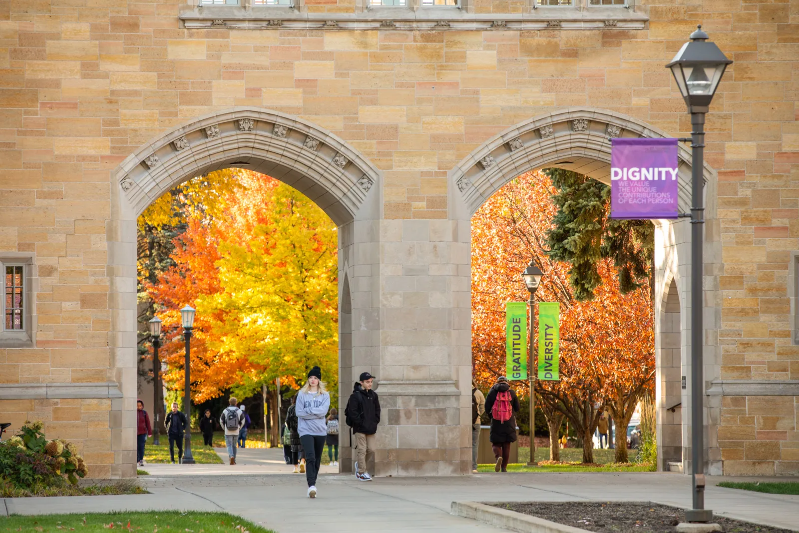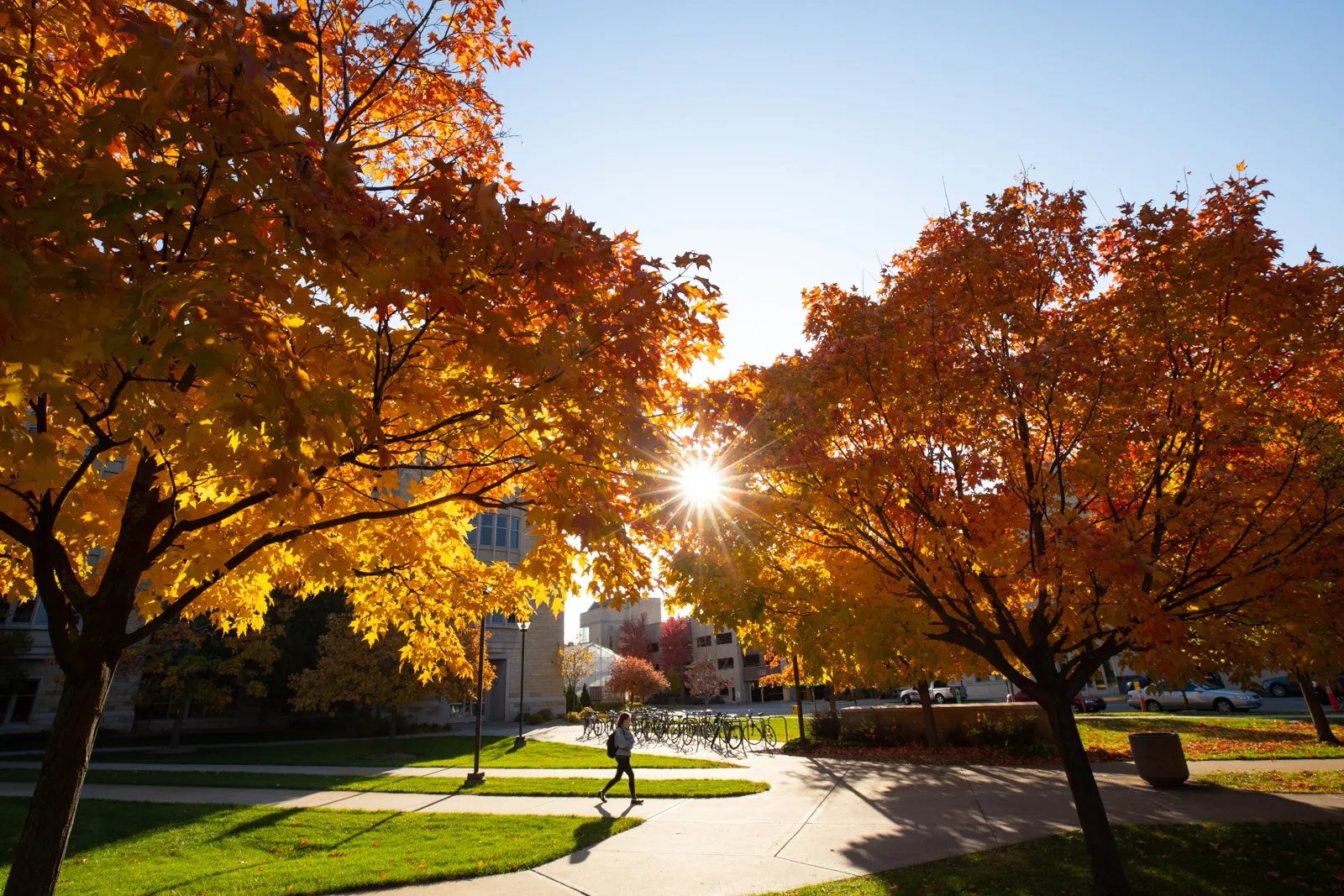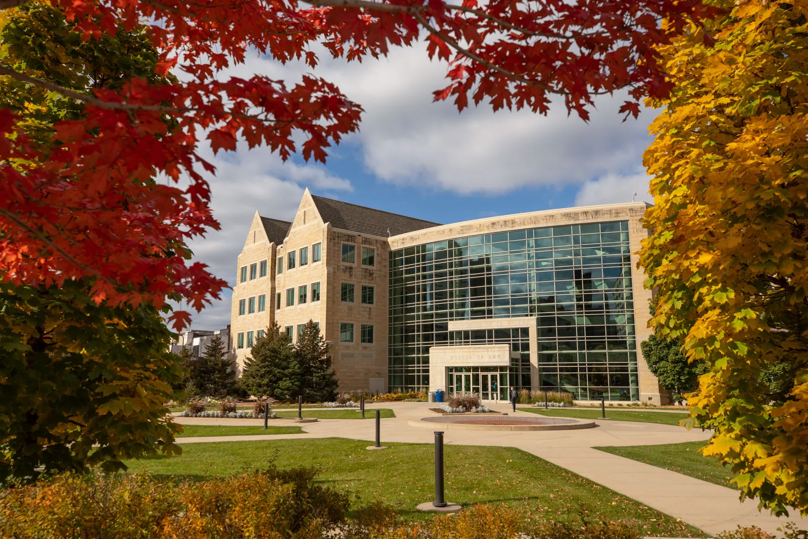 Peak color leaves frame the School of Law building in downtown Minneapolis.