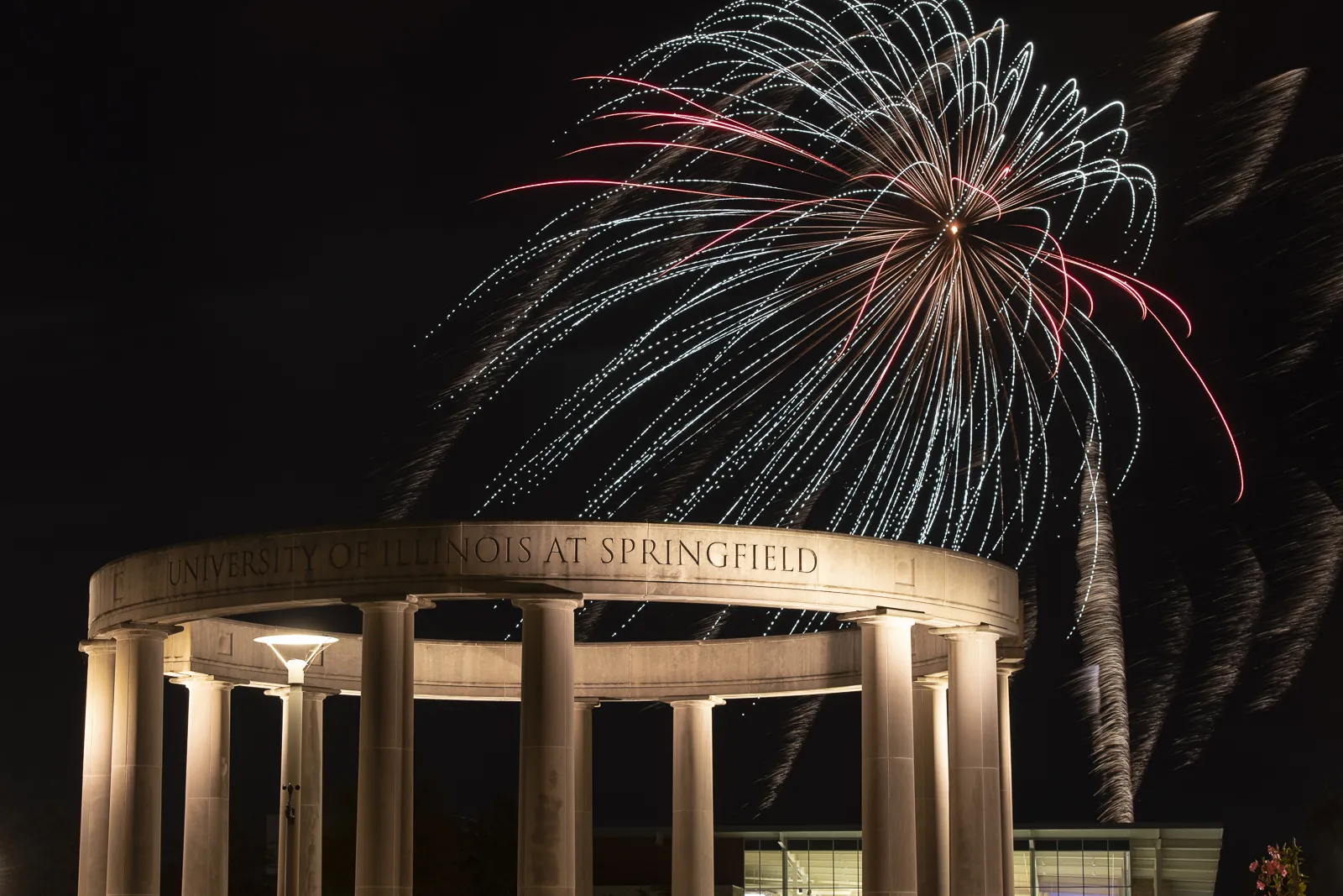 Fireworks light up the sky over the Colonnade in celebration after the Homecoming soccer game on campus.