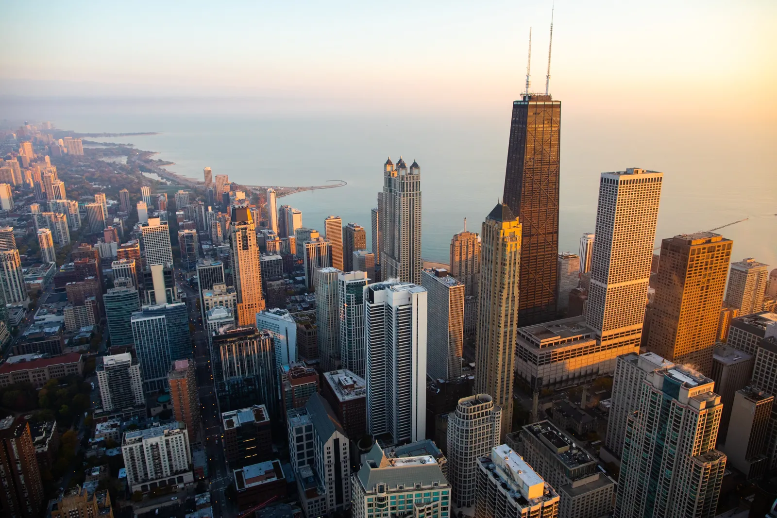 Aerial view of Loyola University Chicago's downtown campus at sunrise.