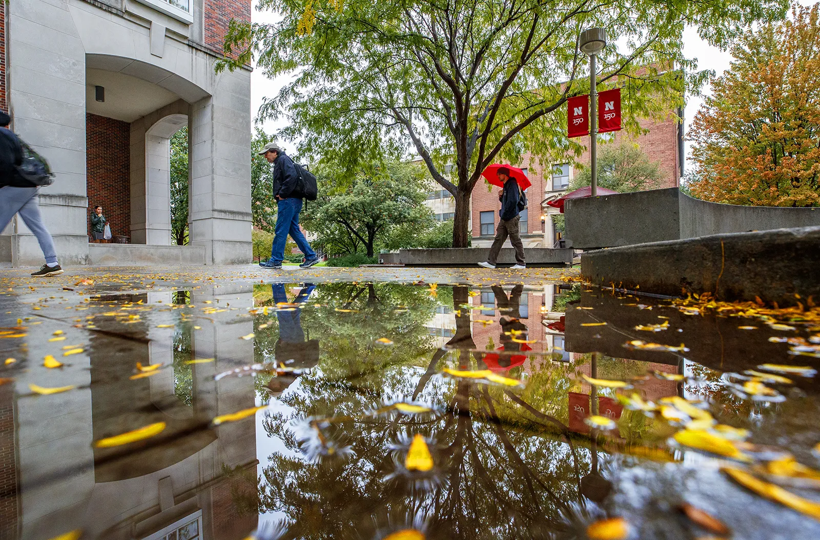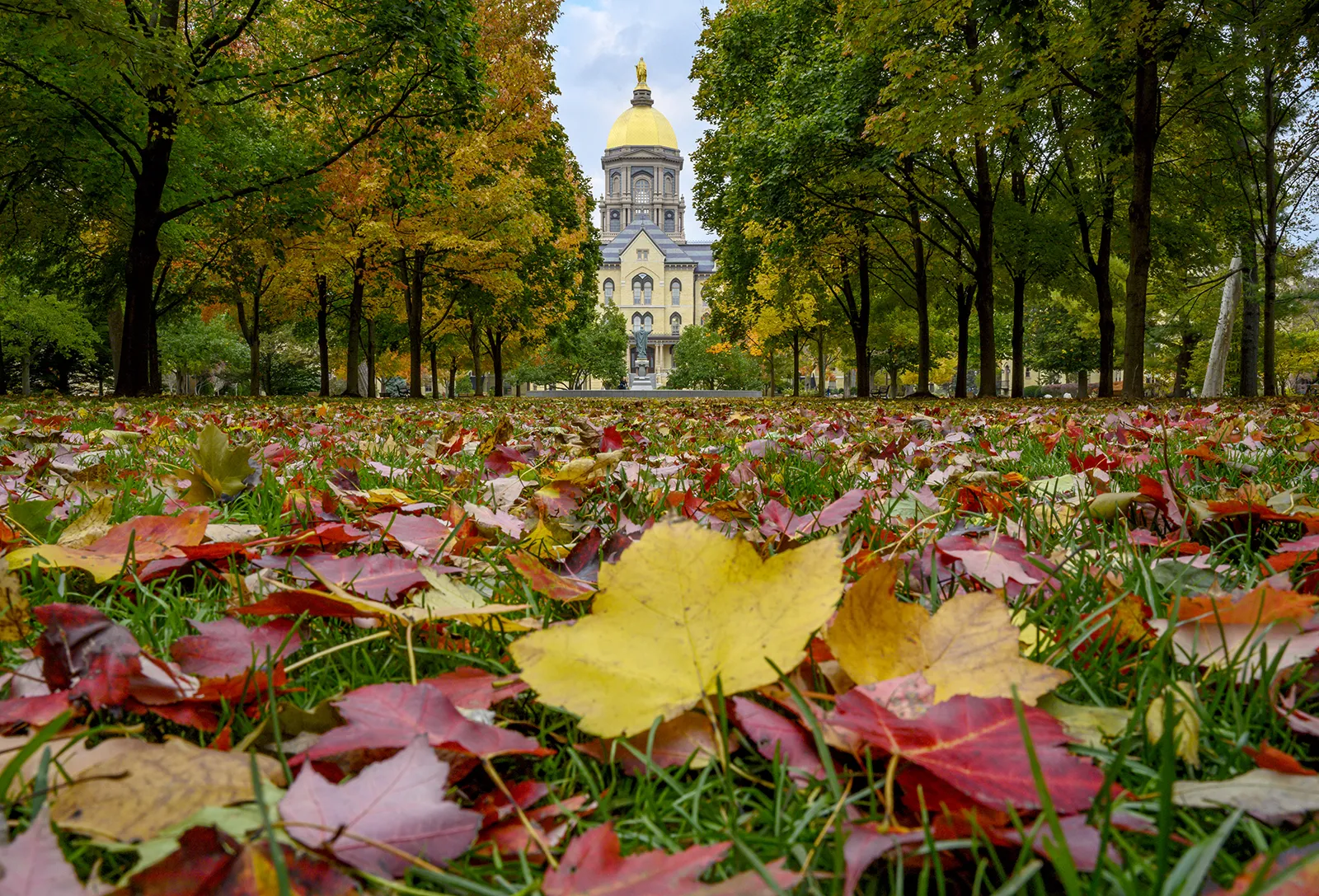 Fallen leaves decorate the Main Quad with autumn colors.