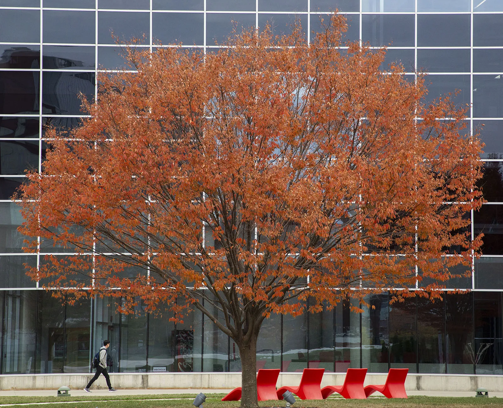 A student walks in between the Recreation and Physical Activity Center and a tree with fall colors on display at The Ohio State University Friday October 25, 2019.