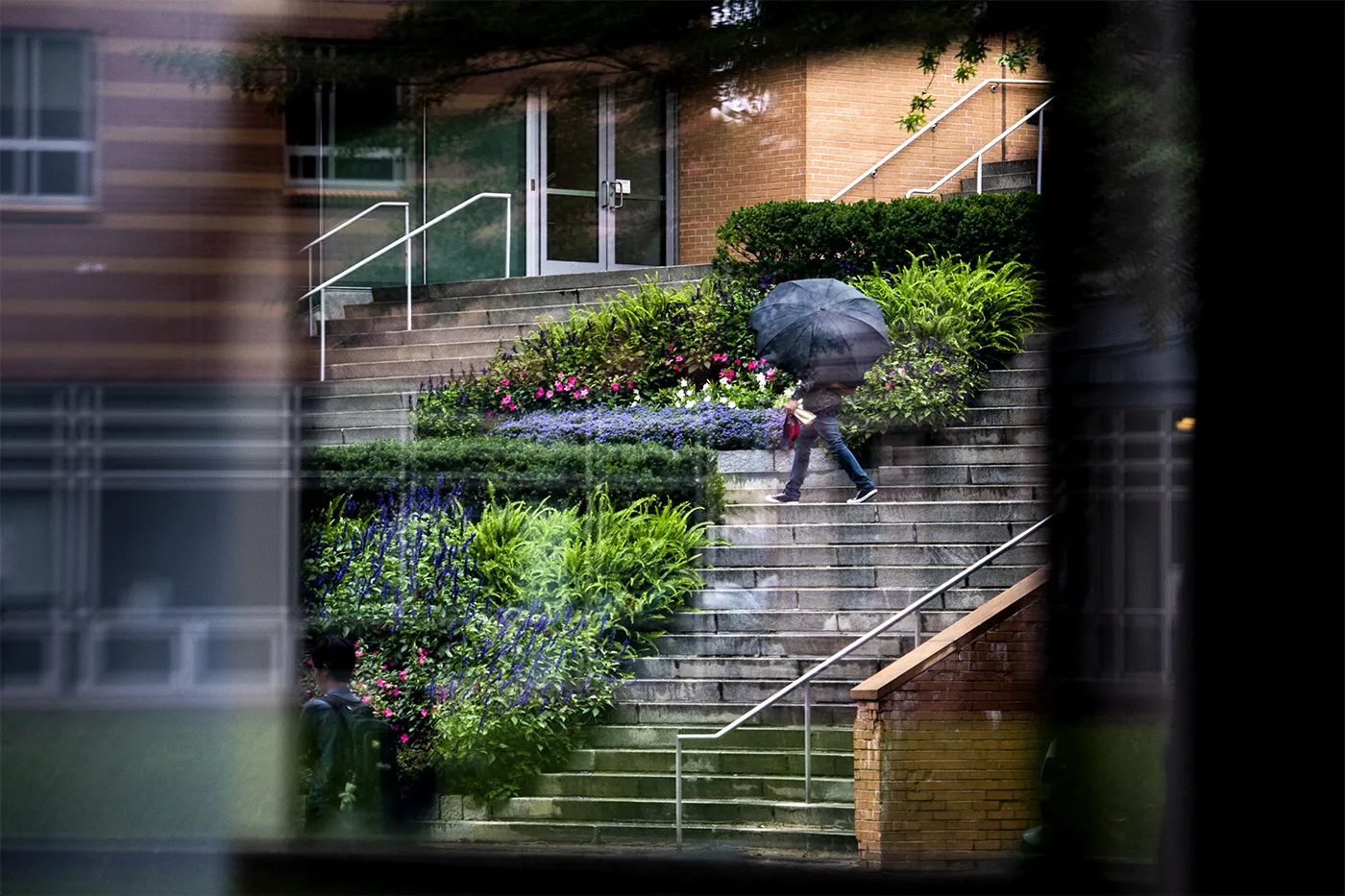 Students pass through the courtyard near the Science and Technology Building on their way to class.