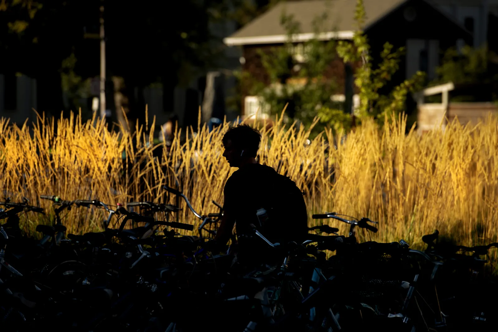 On the first day of classes, a silhouetted student parks his bikes in the bike racks at Rock Hall.