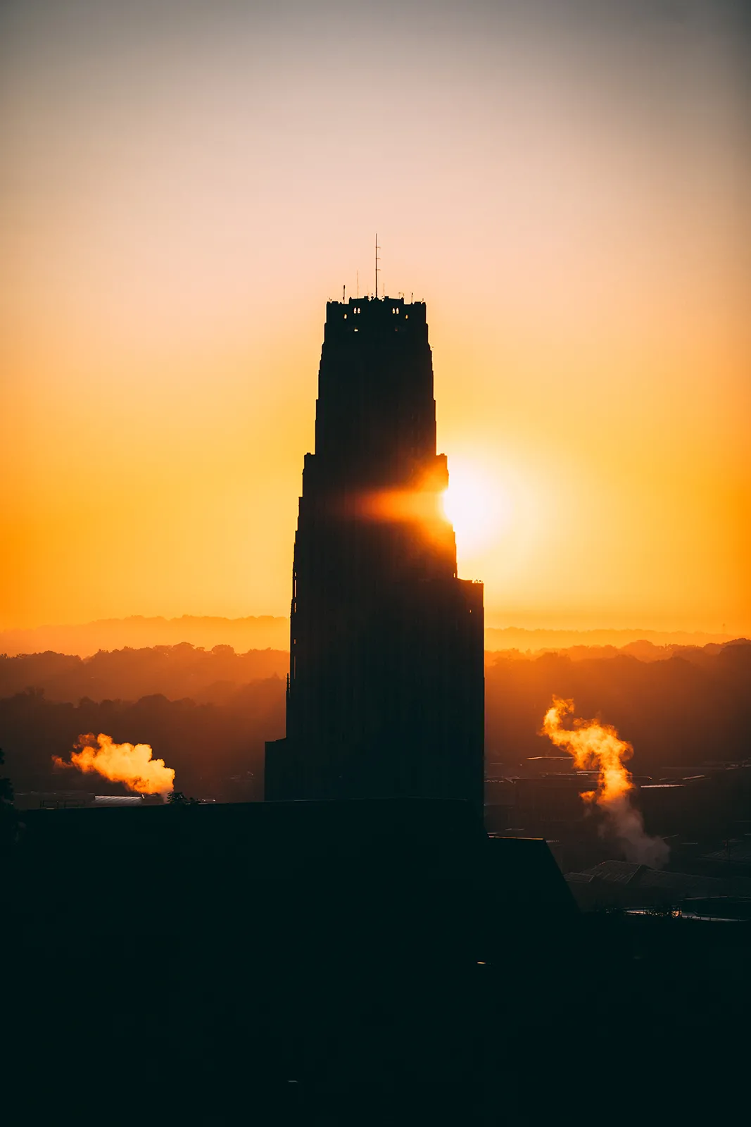 I was on my way into the office and saw the sun rising behind the Cathedral. I quickly got to a better location and waited for the sun to get exactly where I wanted it. The rays of light broke through the trees and rolling hills that surround Oakland.