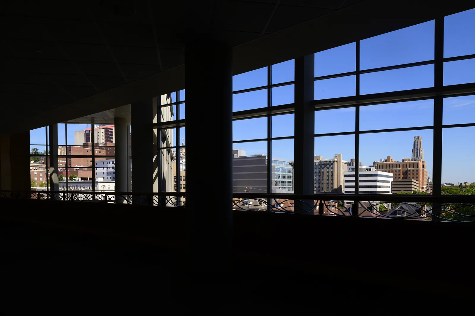 University of Pittsburgh, Oakland campus, framed through the windows of UPMC Magee-Womens Hospital.