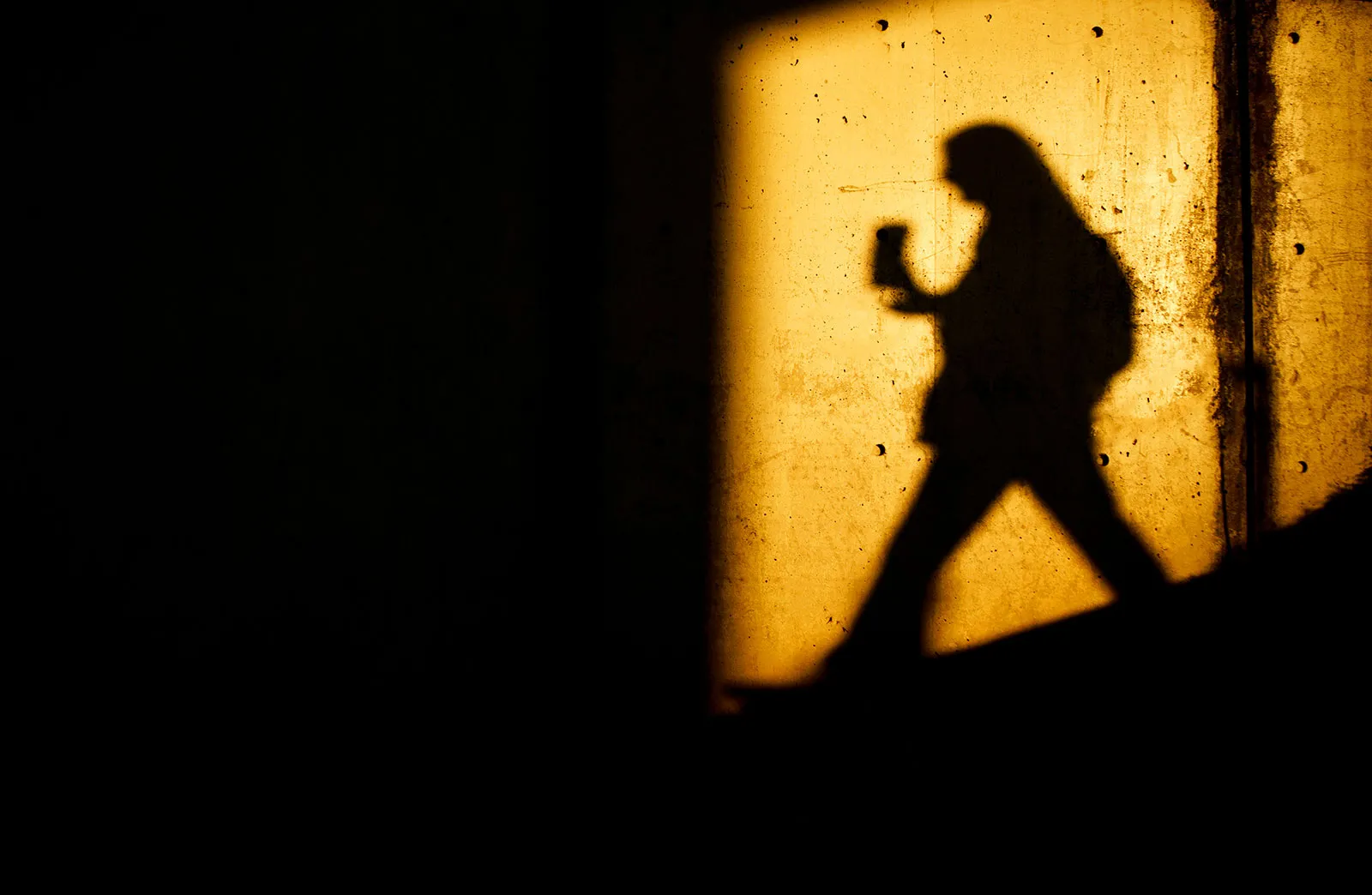 A student's shadow is cast on the wall of the Art and Architecture Building as they walk to class.