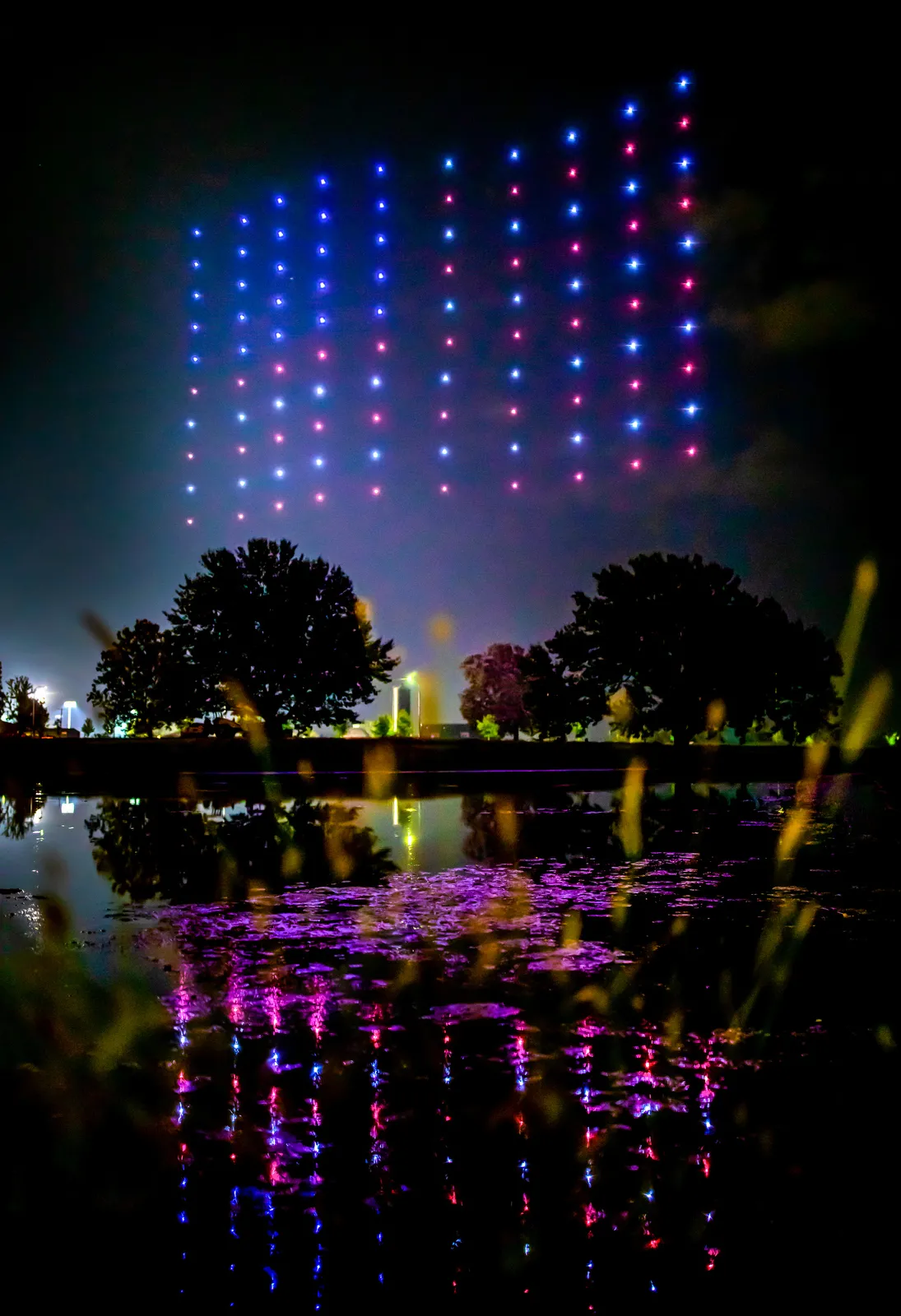 One hundred lit drones fly in formation to celebrate the 75th year of the Aerospace Engineering department. Similar in some ways to a fireworks show but without the smoke, the drones are computer-synchronized to fly in interweaving, intricate patterns creating undulating shapes, including an American flag.