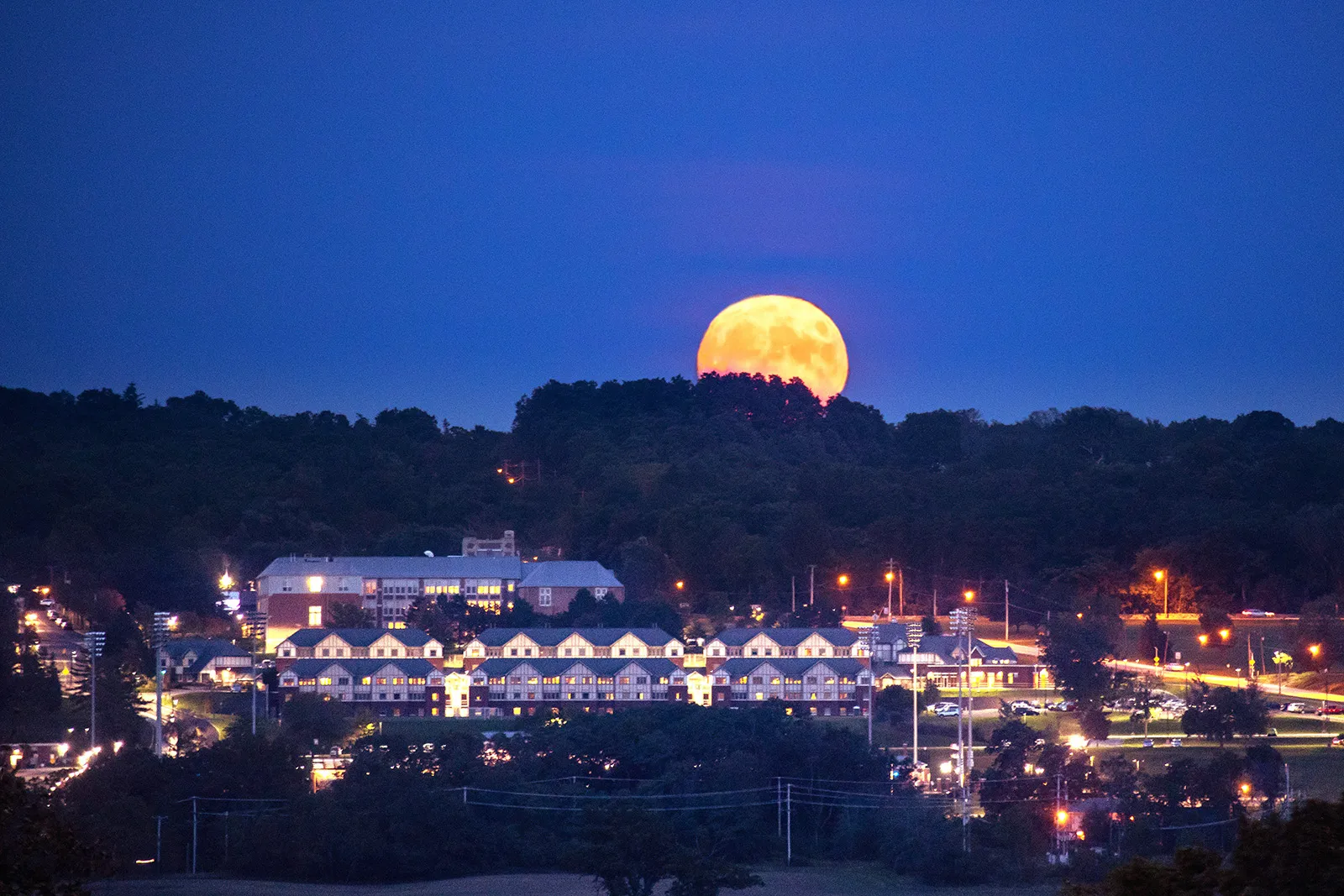 A rare Friday the 13th "Harvest Moon" rises for the first time in decades over campus.