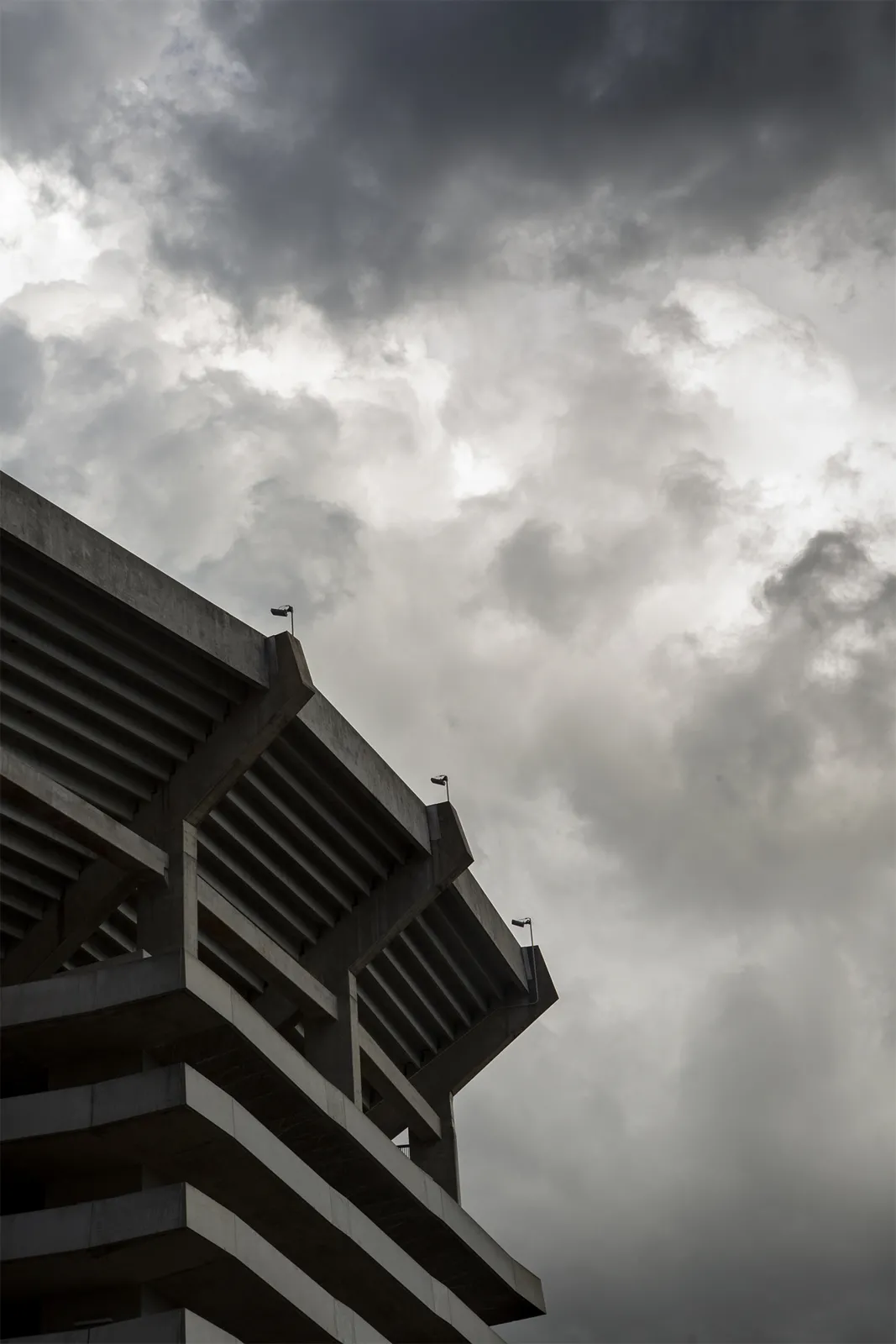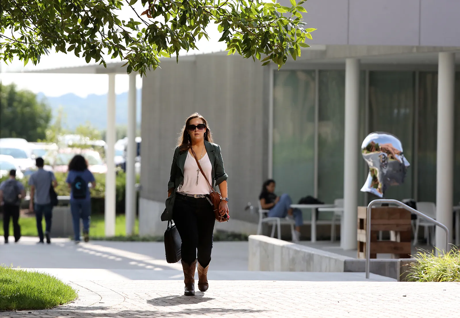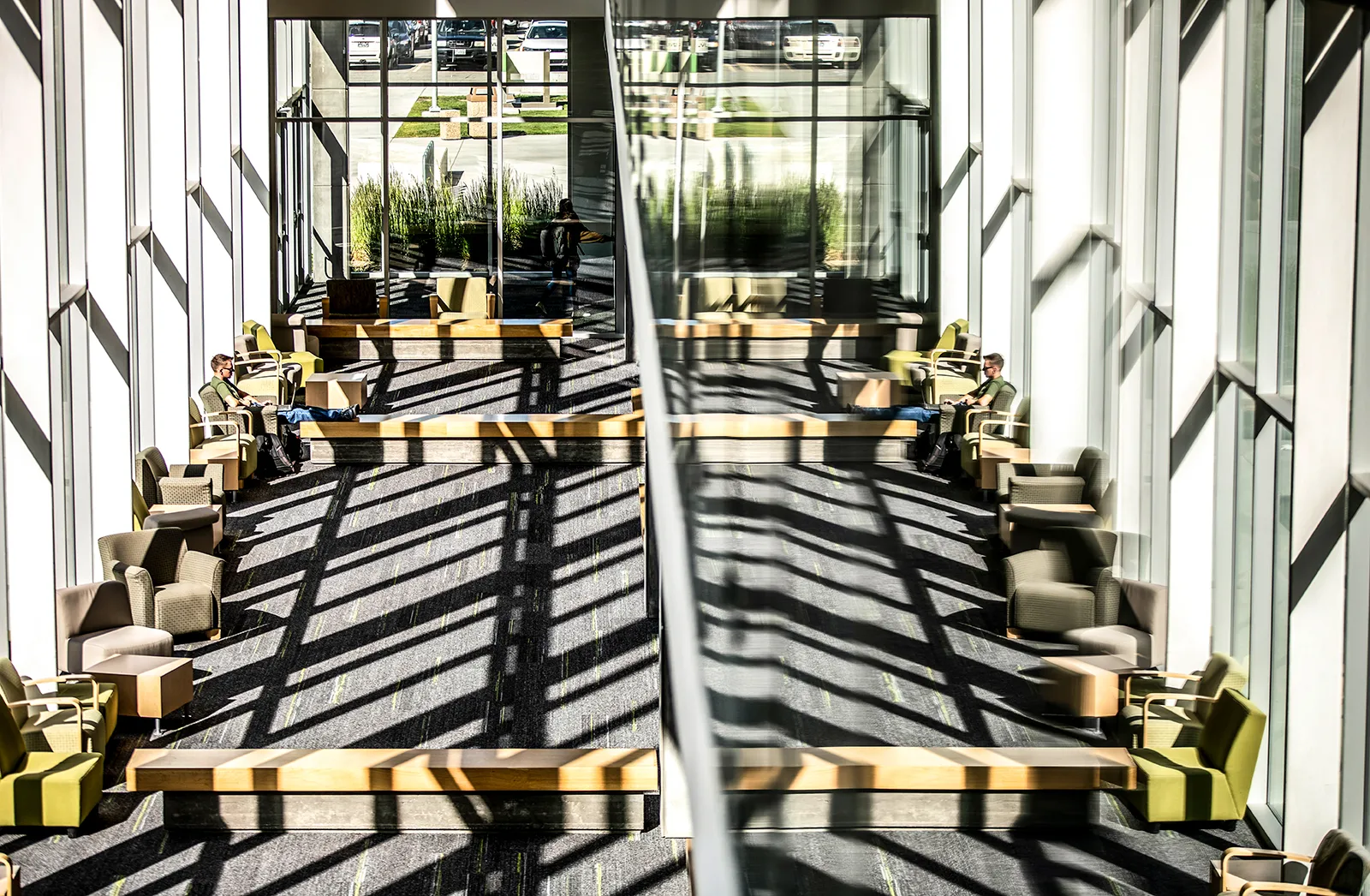 Light and shadows reveal the architecture of the Clarke Classroom Building during a slow summer afternoon on campus.