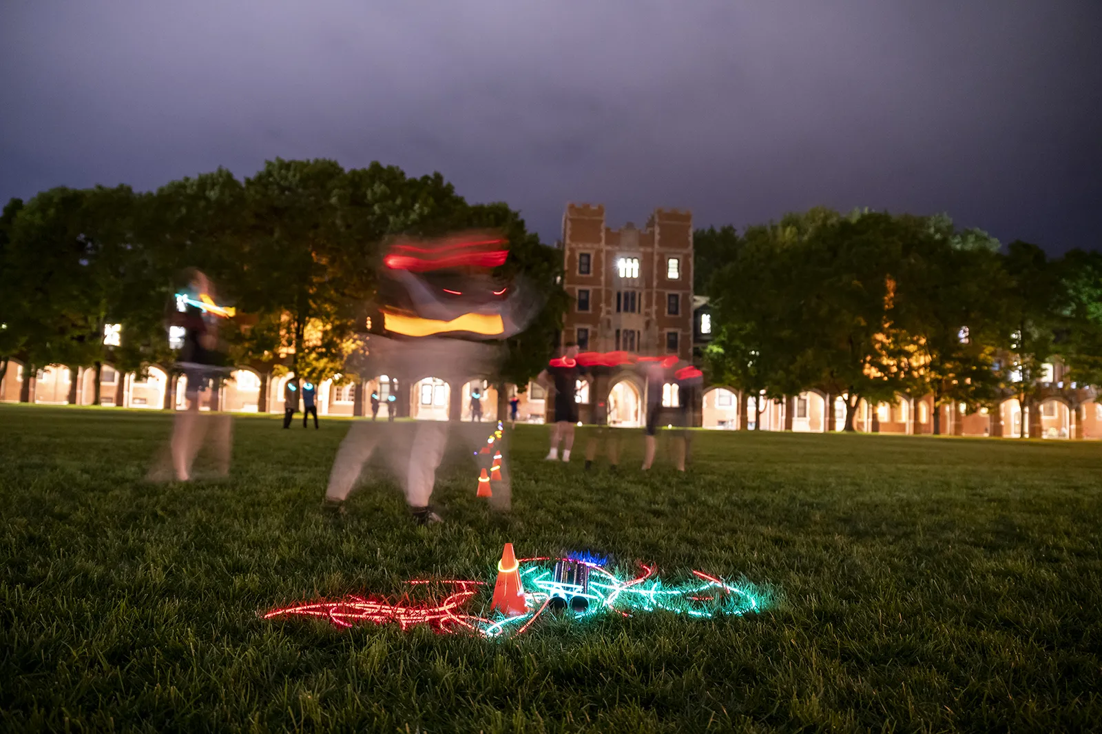 Students wearing glow necklaces participate in glow in the dark capture the flag during new student orientation on Mac Field in front of Gates Rawson tower.