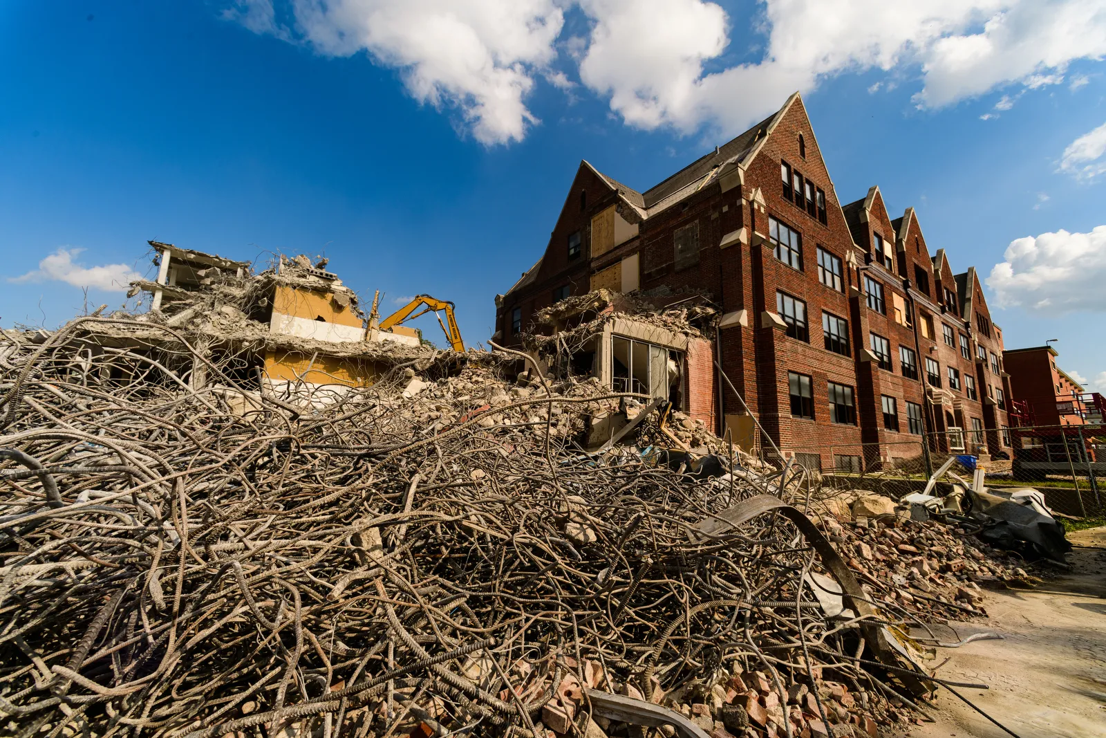 A large mechanical claw tears pieces of a residence hall down during a project where our campus is demolishing outdated facilities attached to the historic brick residence hall on the right, which will be restored and modernized for a new residence hall.