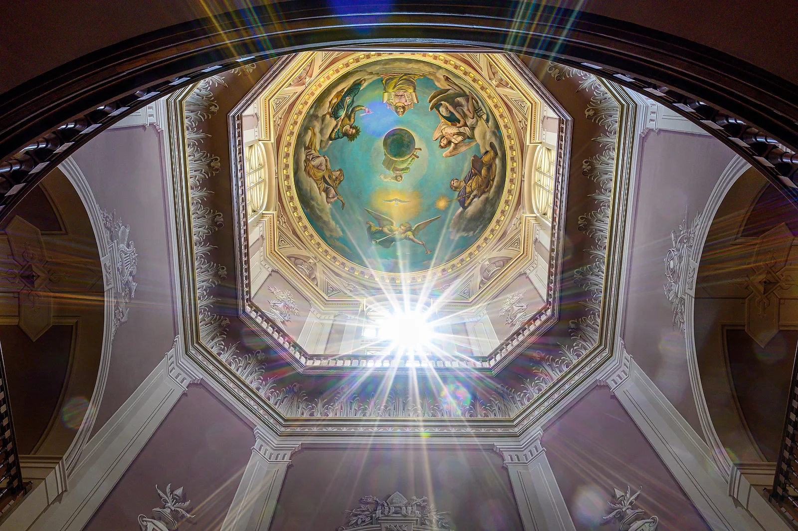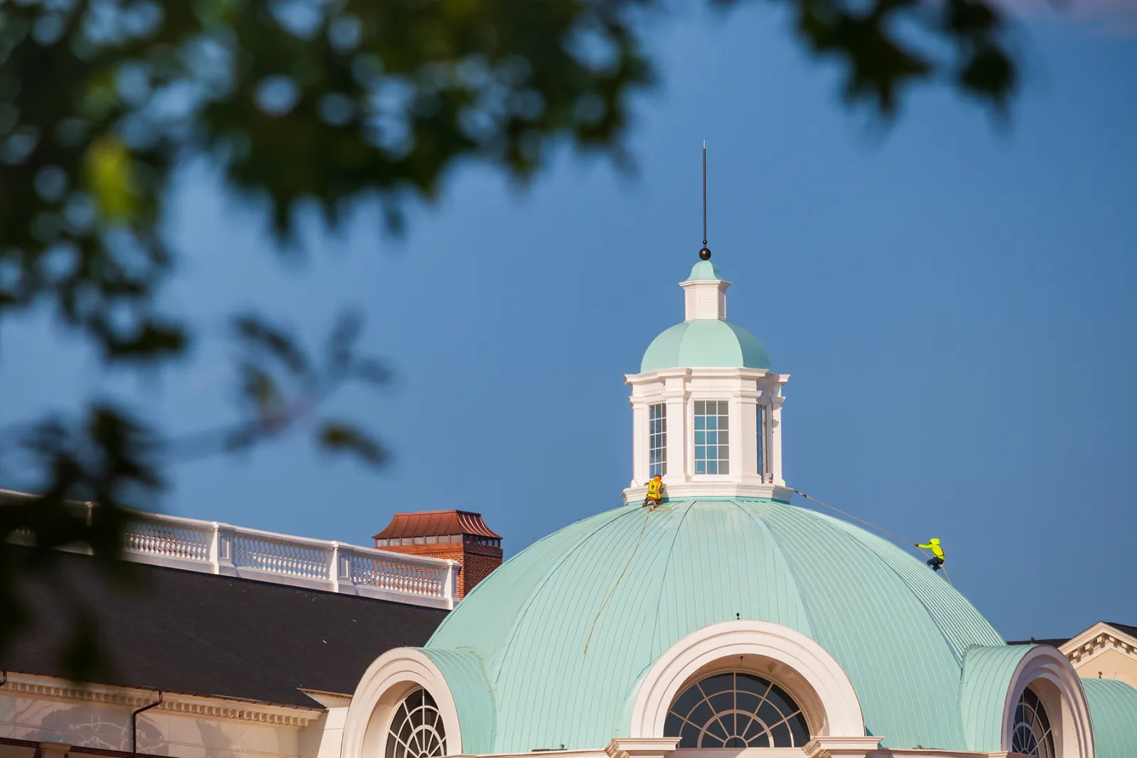 Workers put the finishing touches on the dome of the new Wanek School of Natural Sciences.