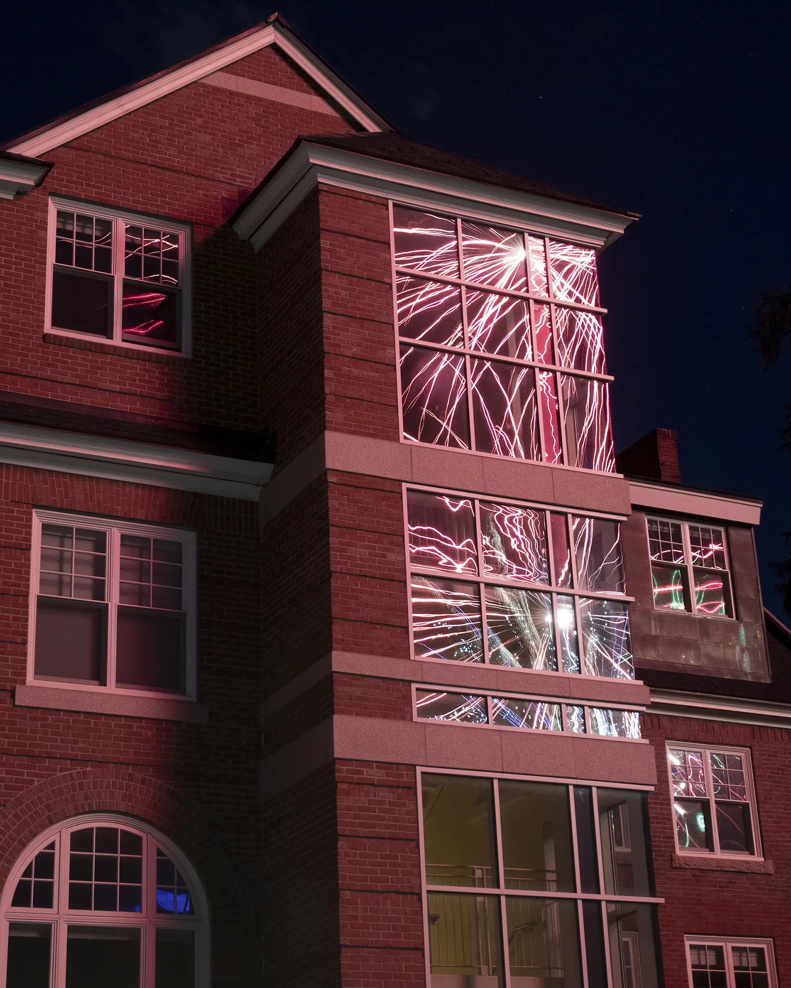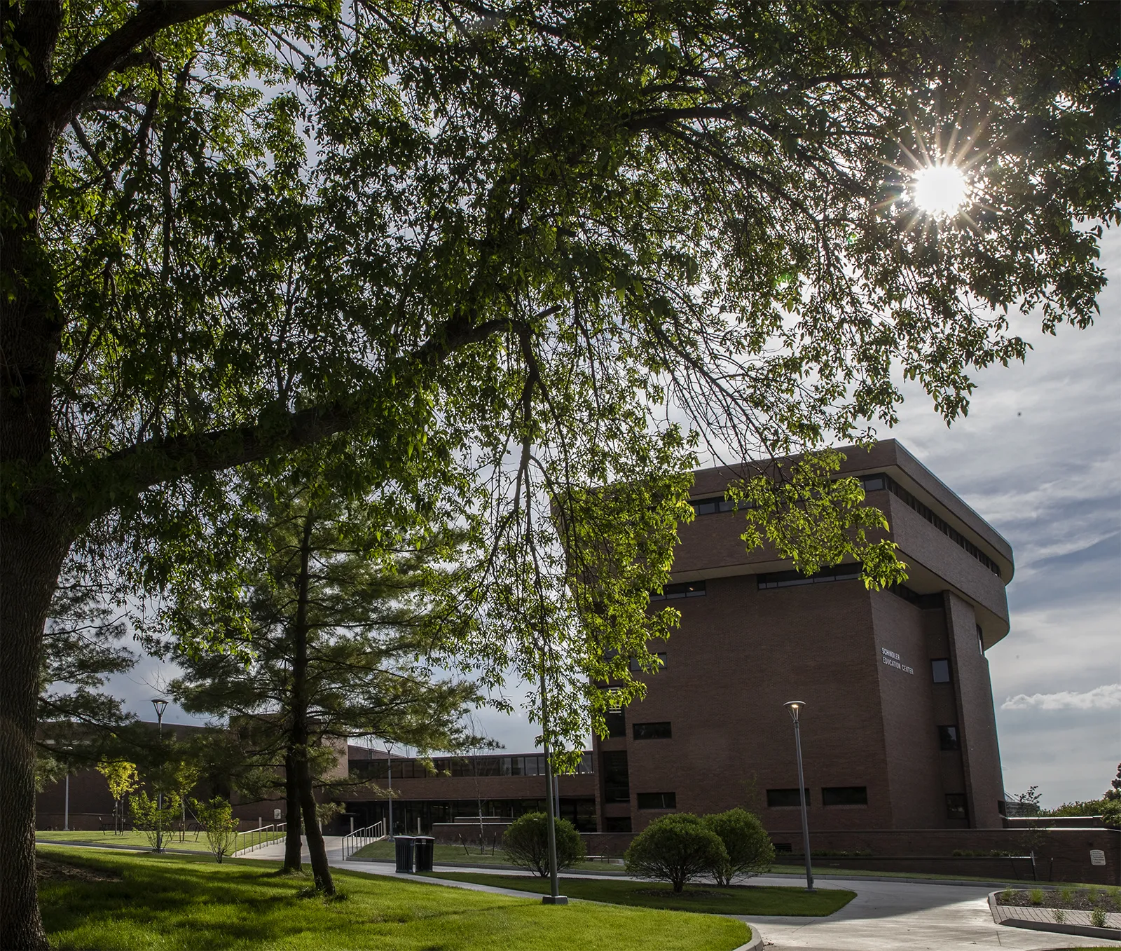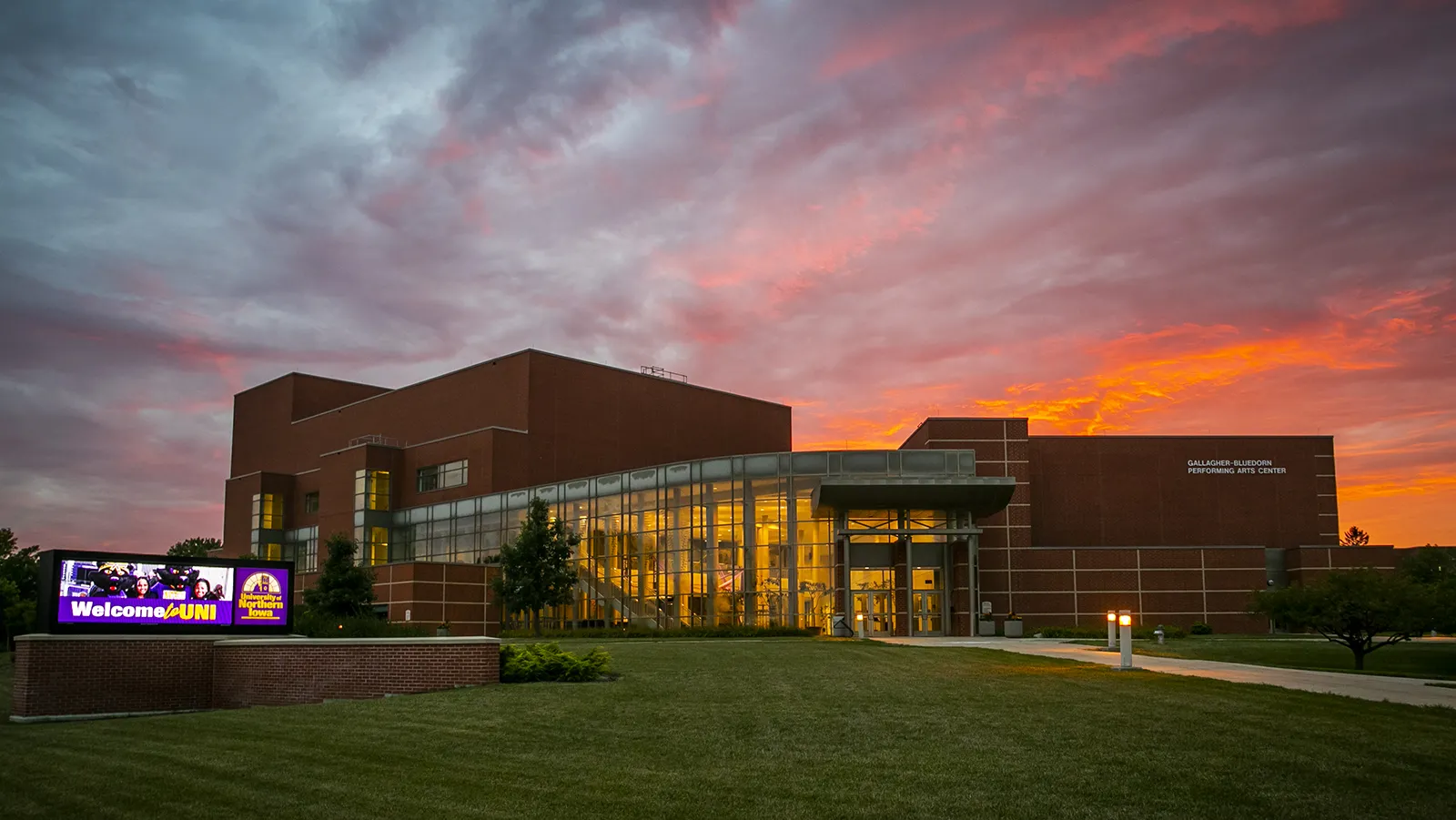 The sunset over Gallagher Bluedorn Performing Arts Center
