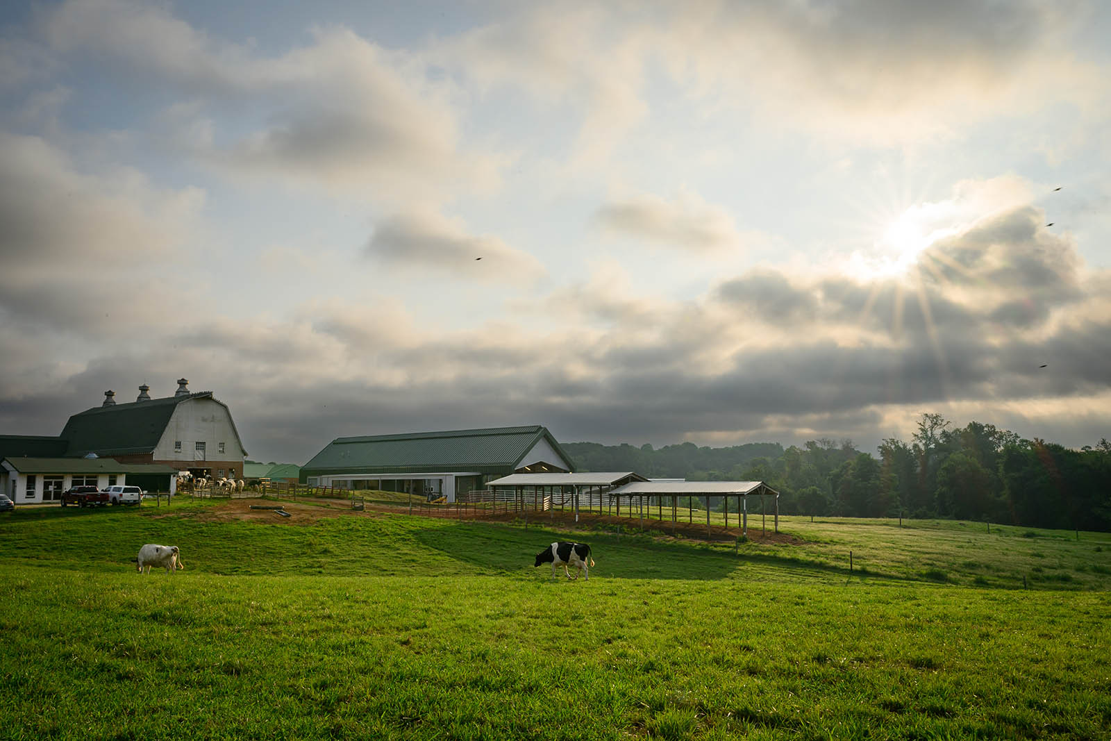 The sun rises over the CVM's famous, nearly hundred year old WPA barns and the brand new, state-of-the-art Terry Dairy Barn.