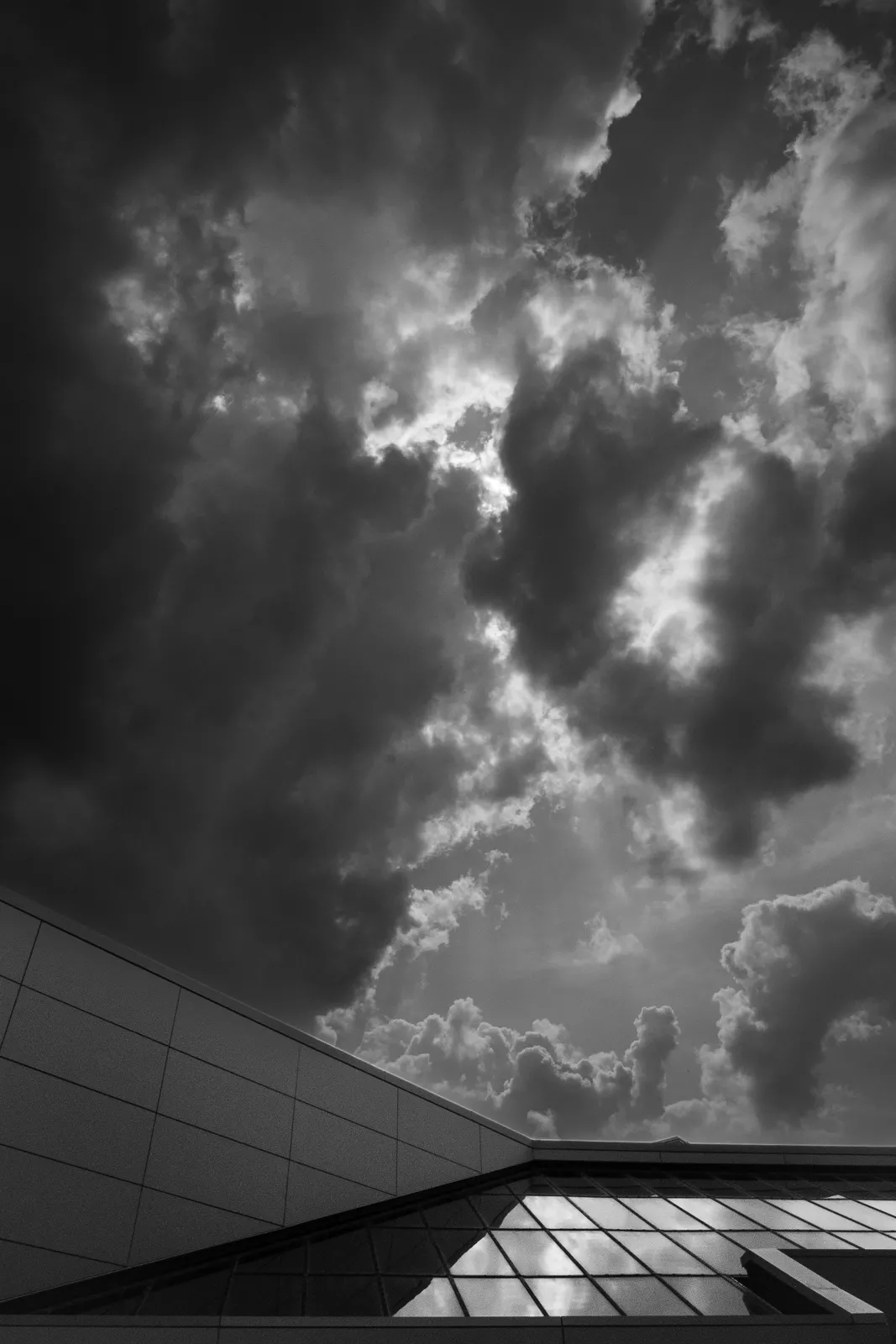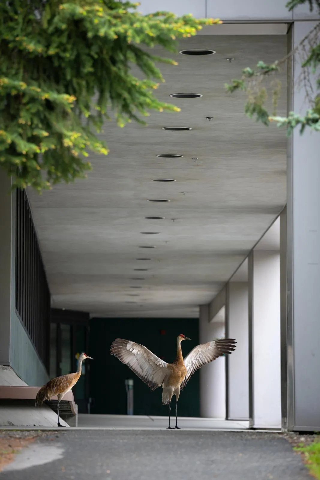 A pair of sandhill cranes stay dry under the awning of UAA's Administration and Humanities Building on a rainy summer morning.