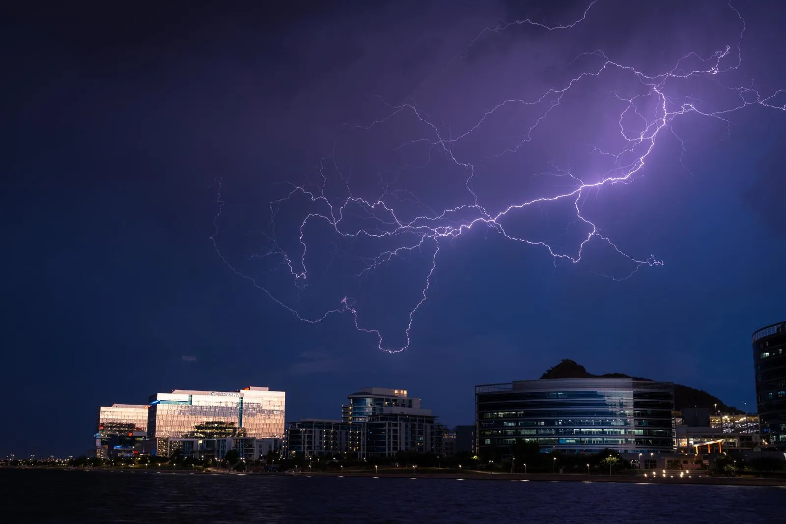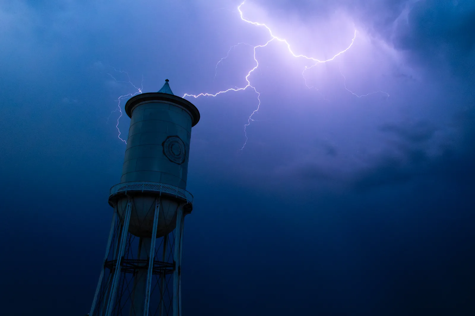 Campus icon, the Marston Water Tower, stands amidst a lightning show during a summer storm.