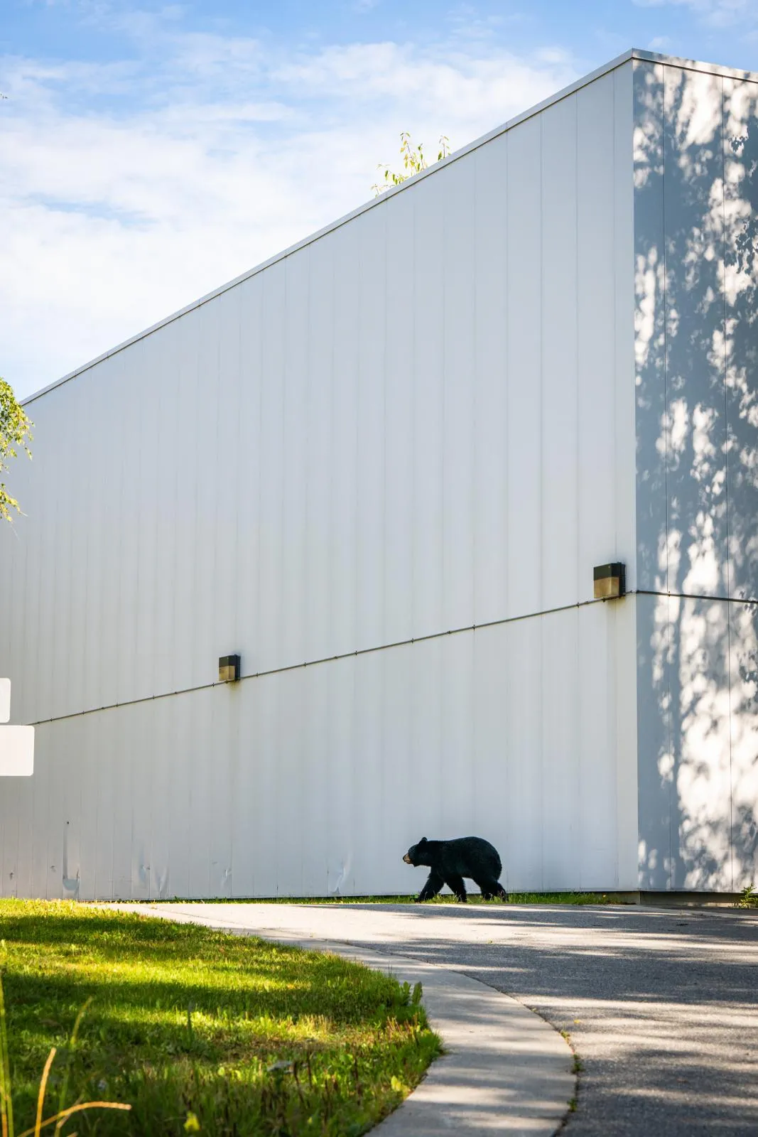 A black bear crosses campus behind UAA's Fine Arts Building on a sunny summer afternoon.