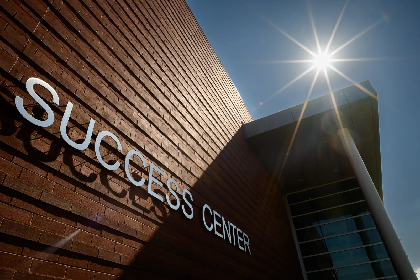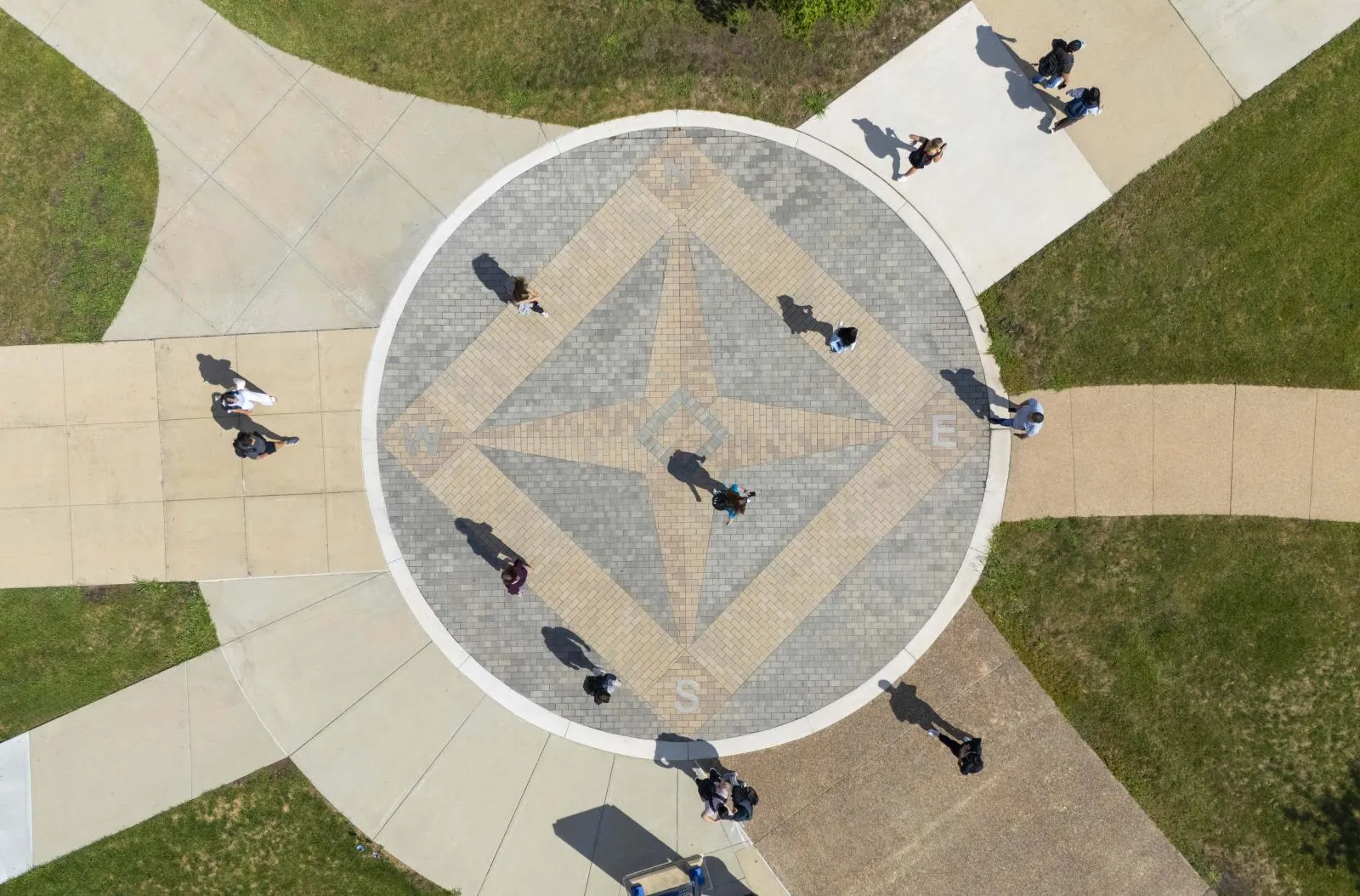 A photograph taken with a drone over the Cardinal direction hardscape in the campus quad.