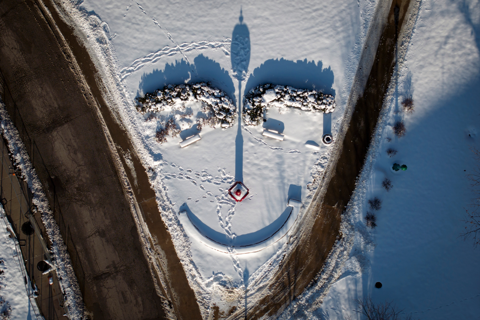 An aerial view of a red clock behind Woodburn Hall seemingly forms a smiling face on a winter day at Indiana University Bloomington on Wednesday, Jan. 8, 2025. Workers continue to clear the campus after a rare winter storm dumped several inches of snow on the campus just days before students are set to return for the beginning of the Spring 2025 semester.