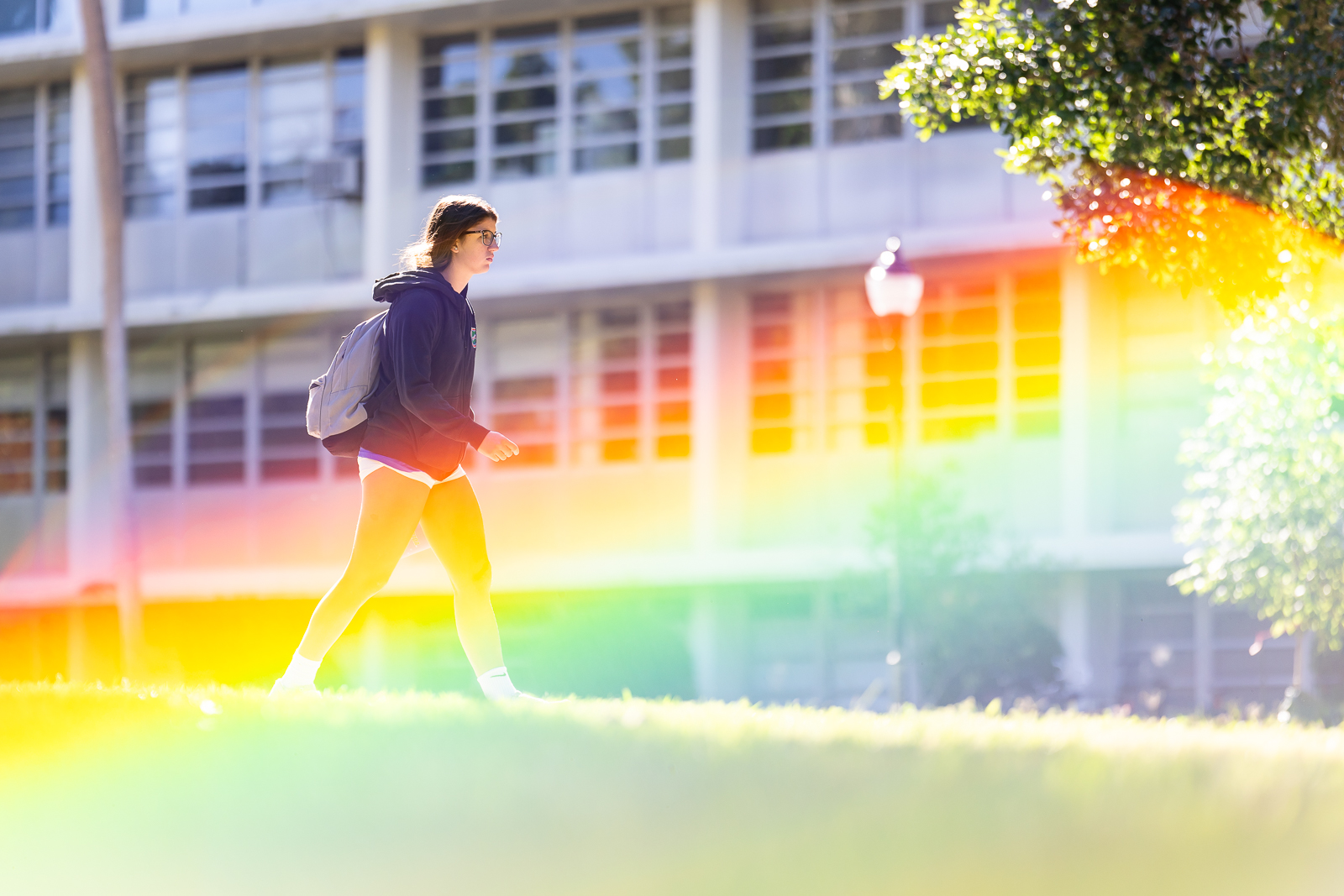 A student walks through campus as a rainbow is reflected through morning dew on Tuesday, April 15, 2025.