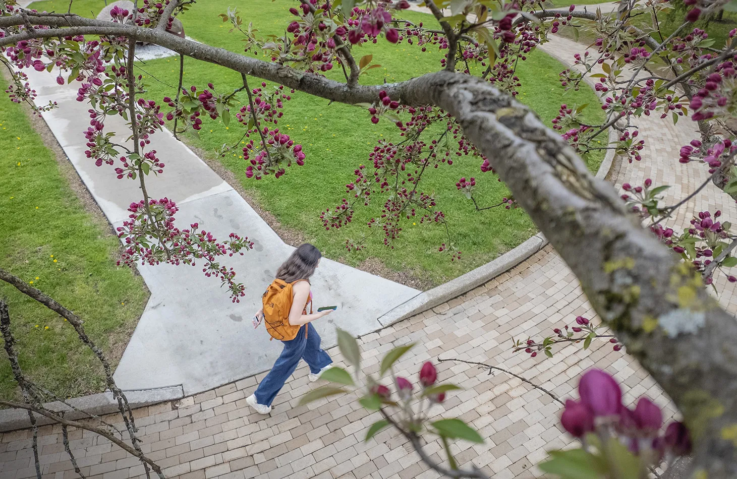 Crabapple trees begin to bloom with little bursts of color in the quad between Hepburn and Carnegie Hall.