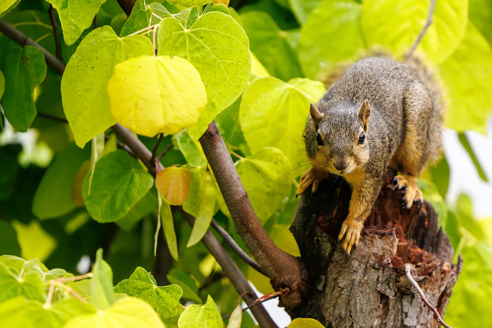 A squirrel hands out on the stump of a tree during a rainy day at the Botanical Garden on Wednesday, May 7, 2025.