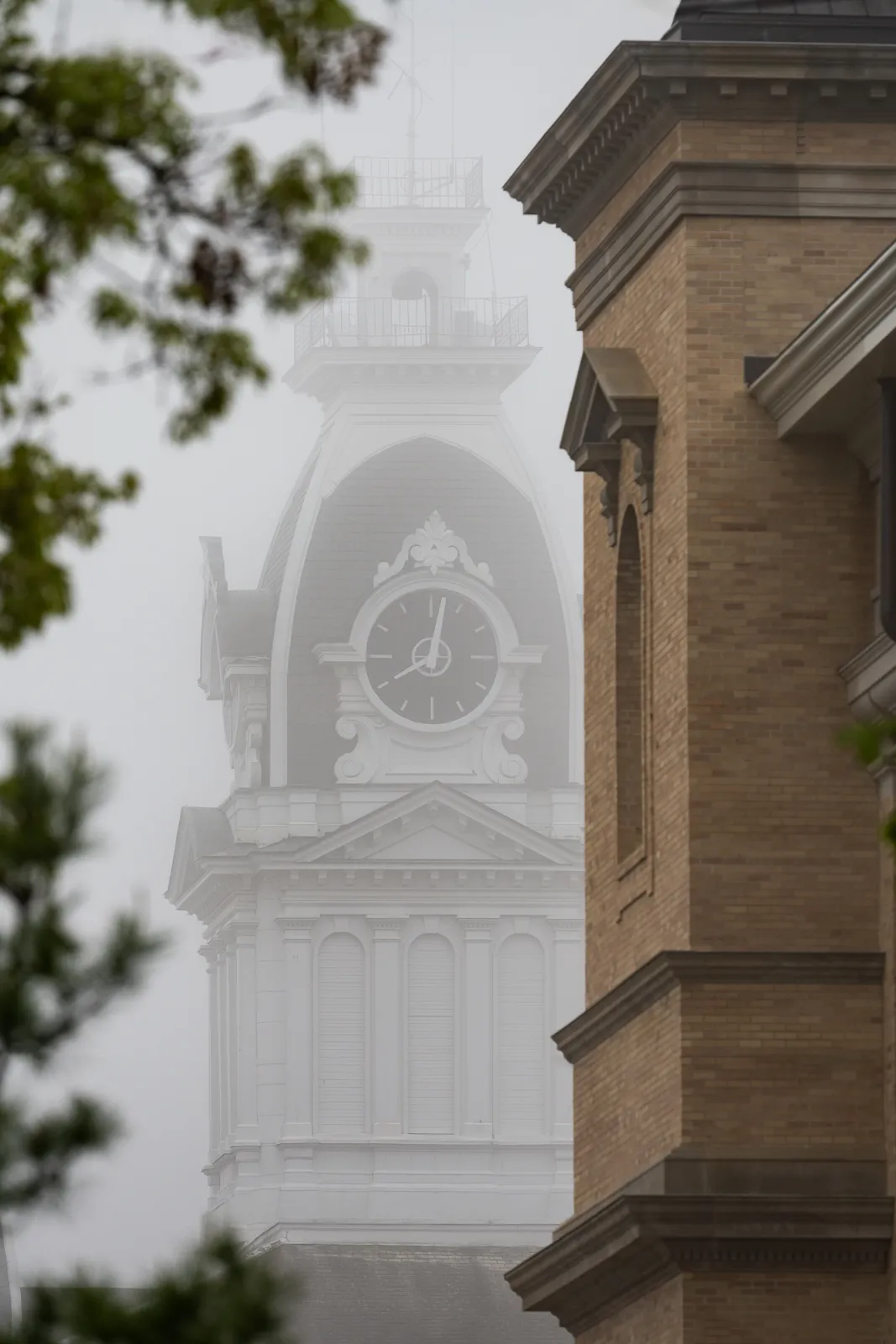 The clock tower of Central Hall looms over campus on a foggy morning.