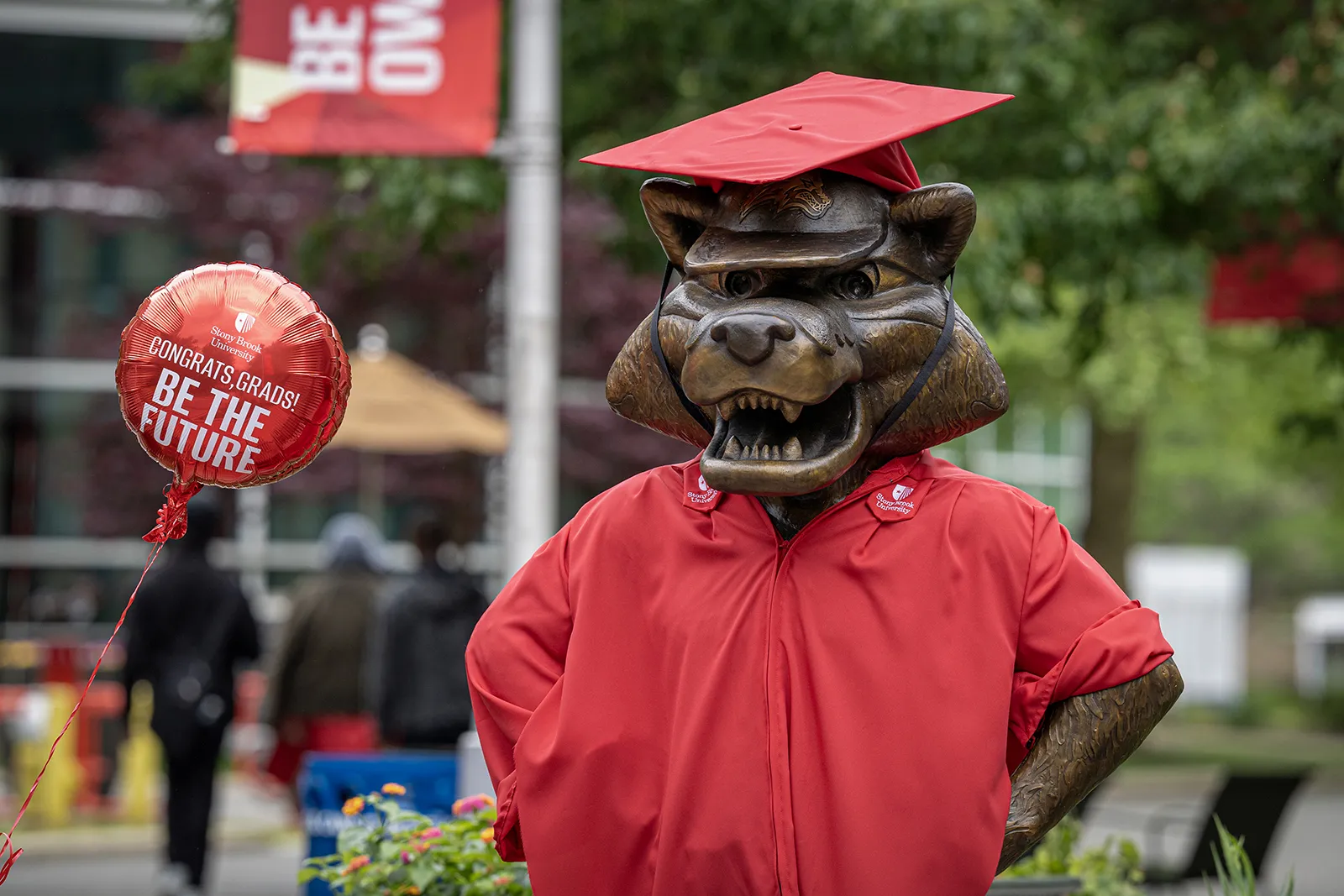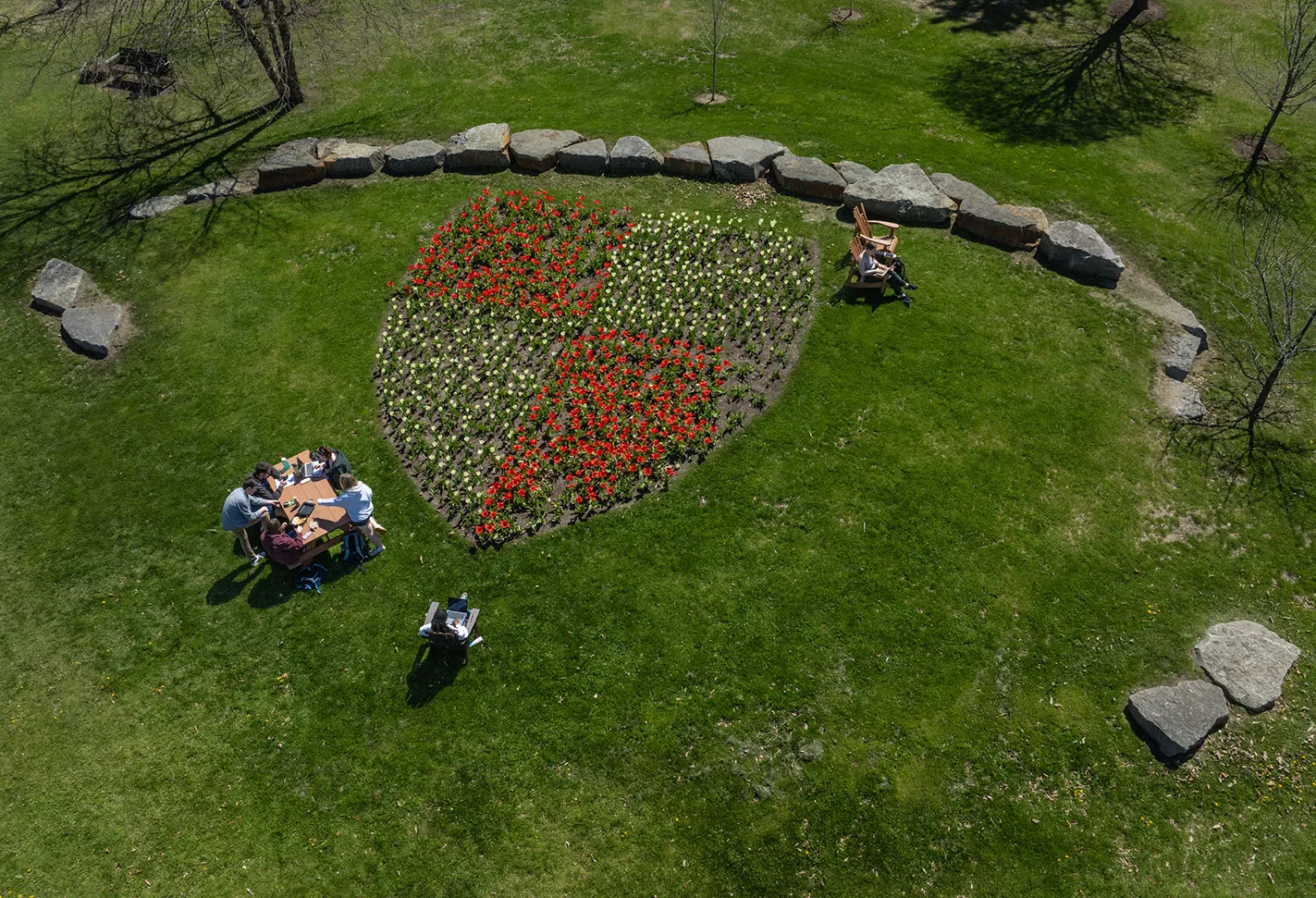 Students study next to a bed of Tulips planted in the shape of the University Shield in the quad outside of the Student Center.