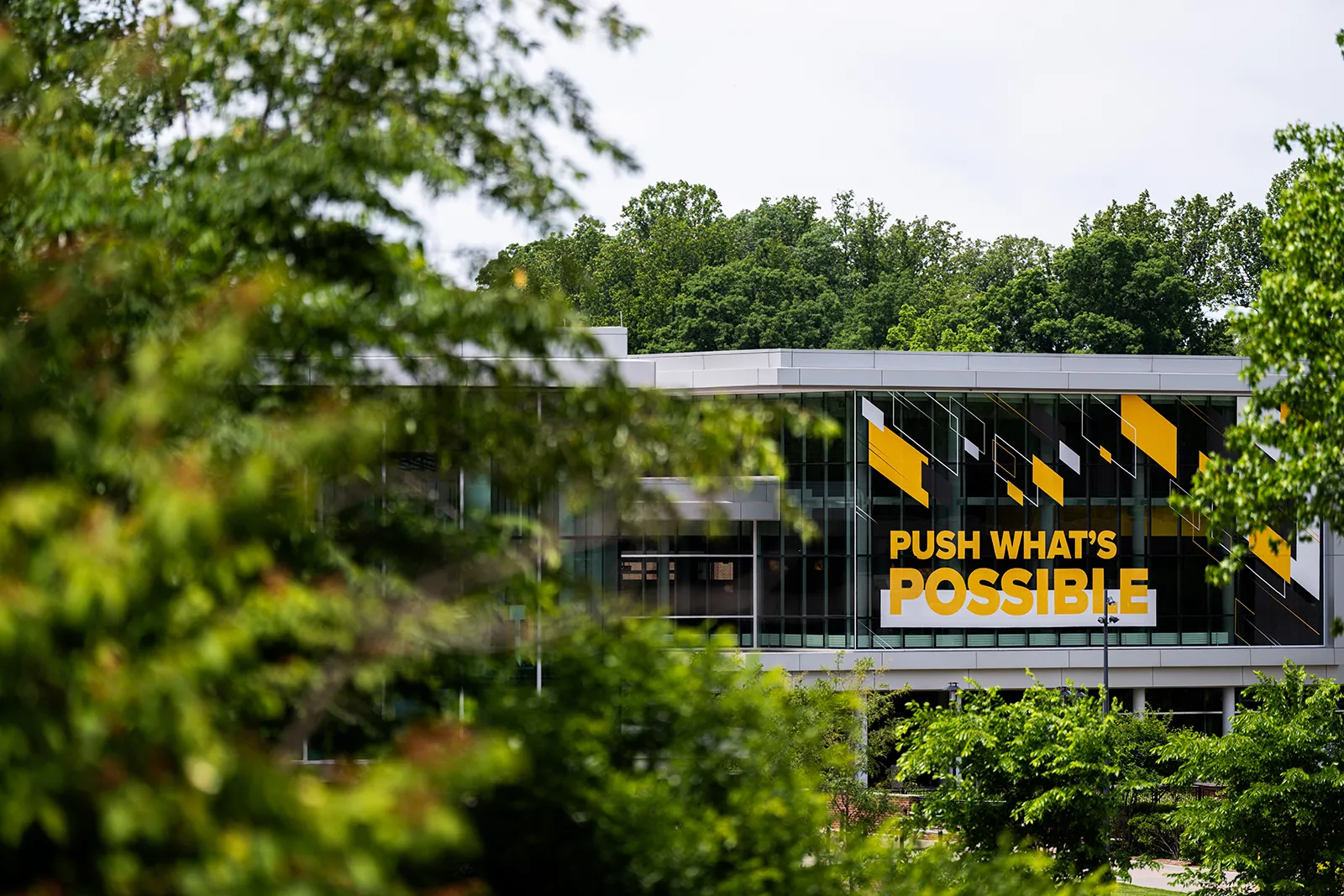 A shot of our campus gym wrapped in a vinyl that says "push whats possible" with branded colors and elements.