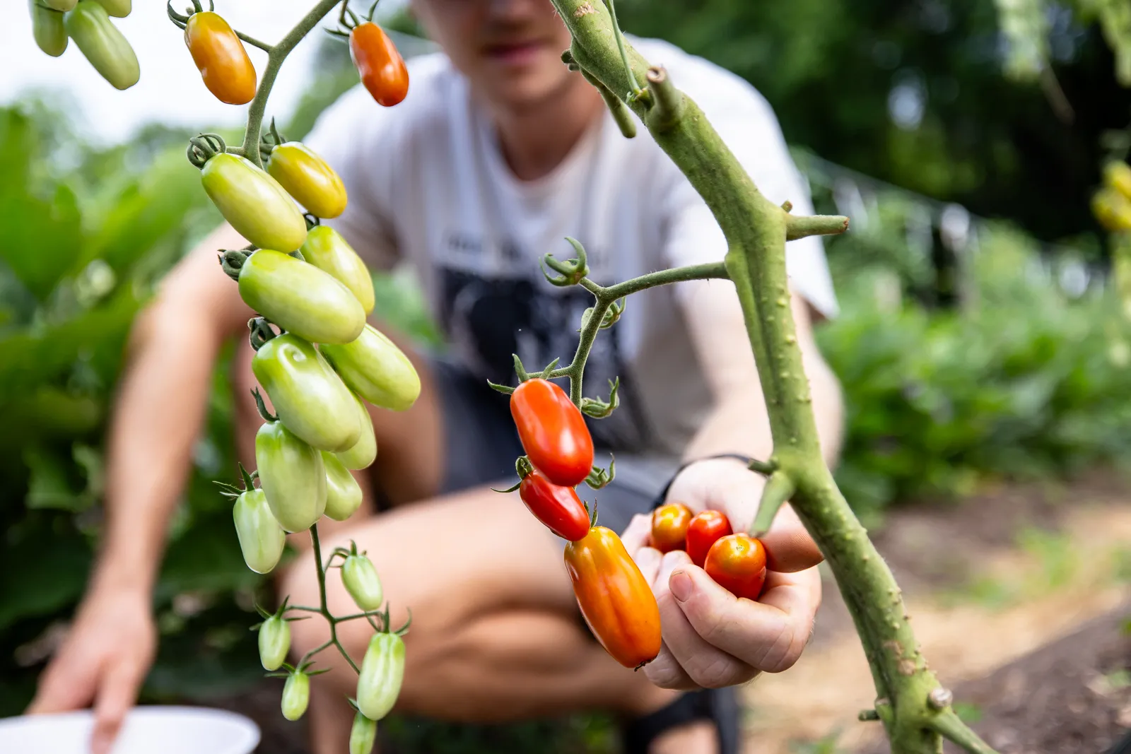 A detail photo of Noah Long, Field & Fork farms manager, harvesting fresh tomatoes at the Field & Fork Farms and Gardens on Thursday, May 8, 2025.