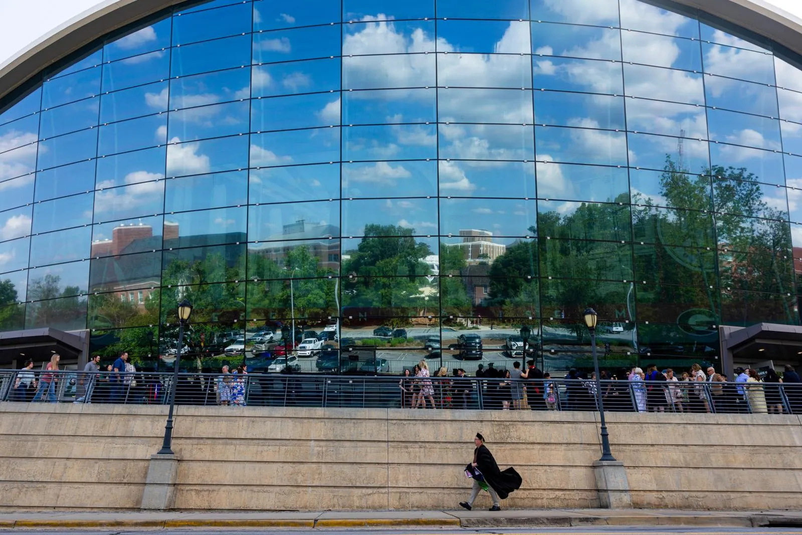 A graduate student's gown catches the breeze as he walks past Stegeman Coliseum after the doctoral commencement ceremony.