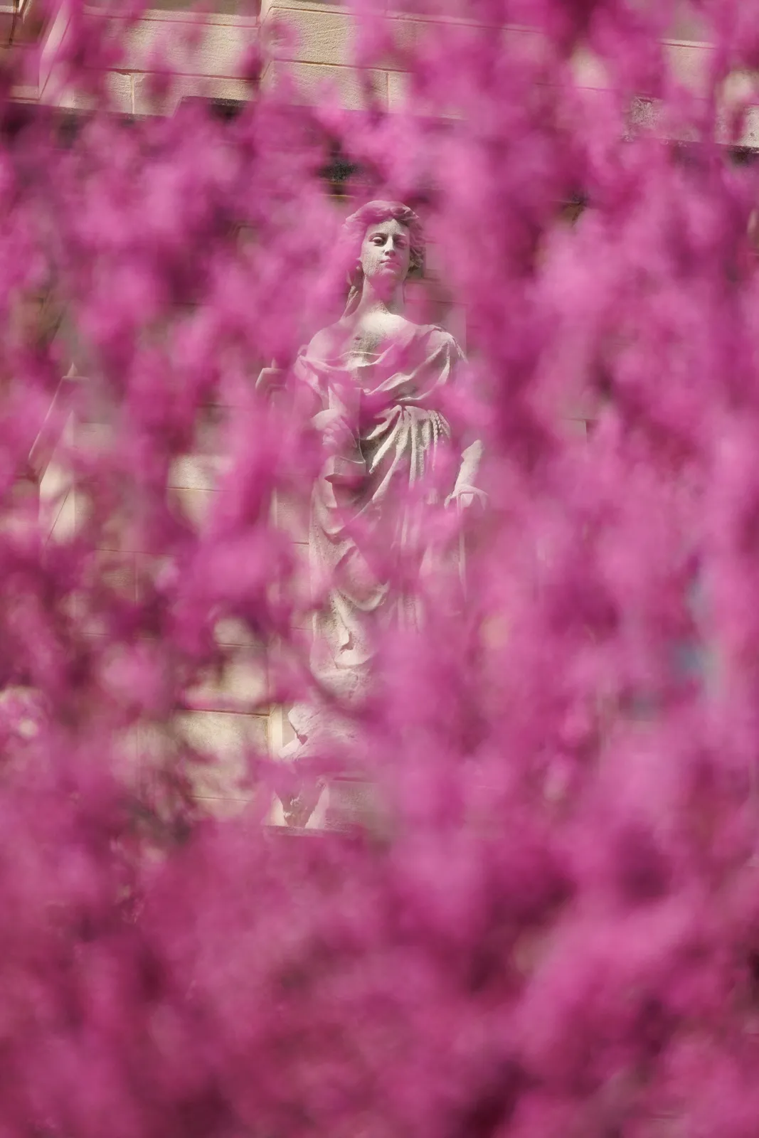 Flowers grow in a flowerpot outside of agriculture hall on Monday, April 7, 2025. A tree limb in the background was removed in photoshop.