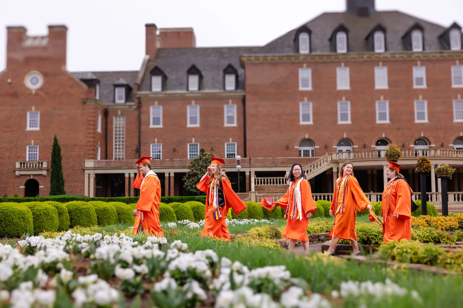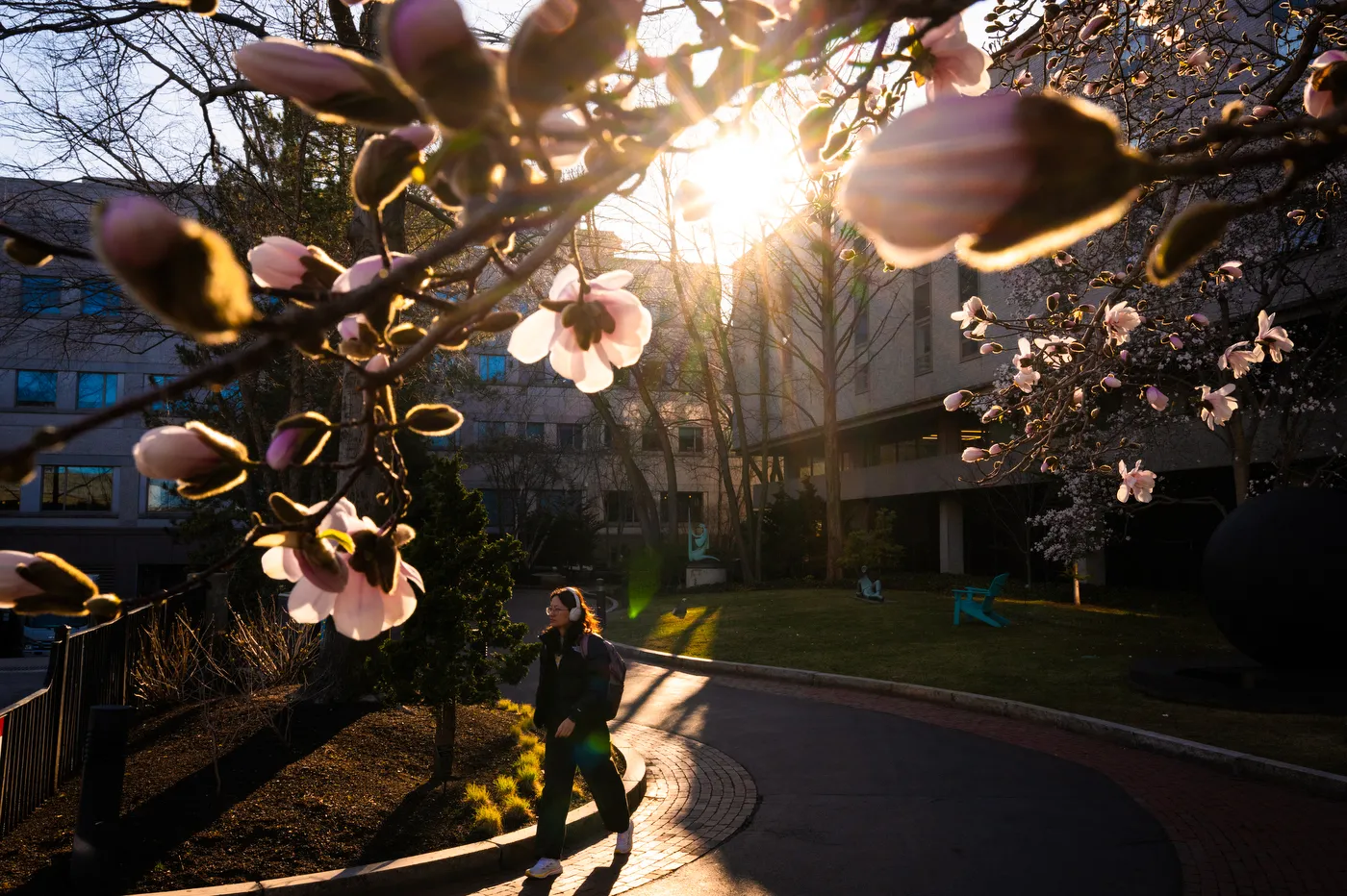 A student walks to class in golden hour light as the magnolia trees are in full bloom in the campus arboretum.