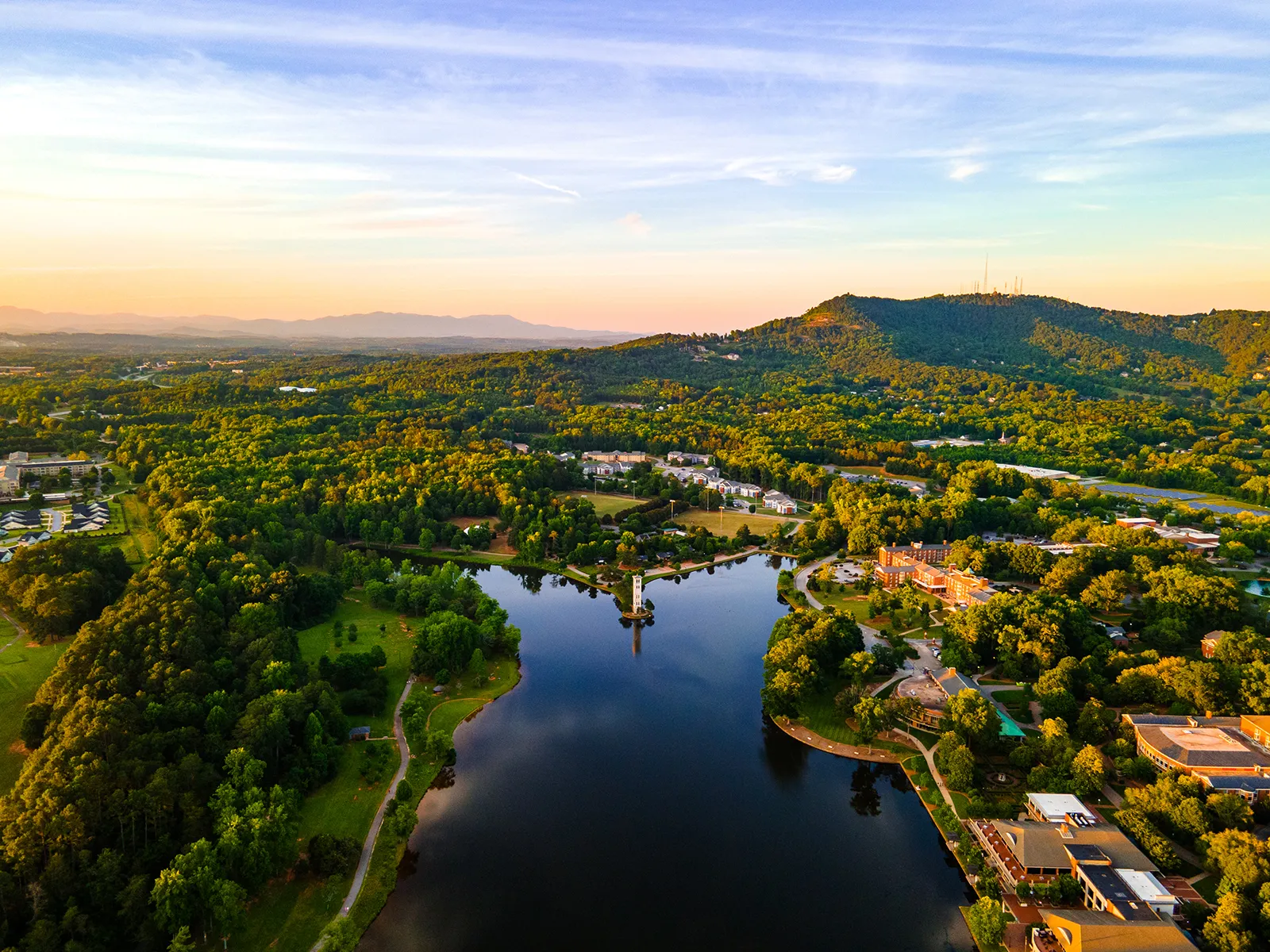 Panorama of three portrait photos merged together in Lightroom classic. Taken on the first day of undergrad classes, August 26th, 2024 at sunrise before the hustle and bustle of campus sprung to life.