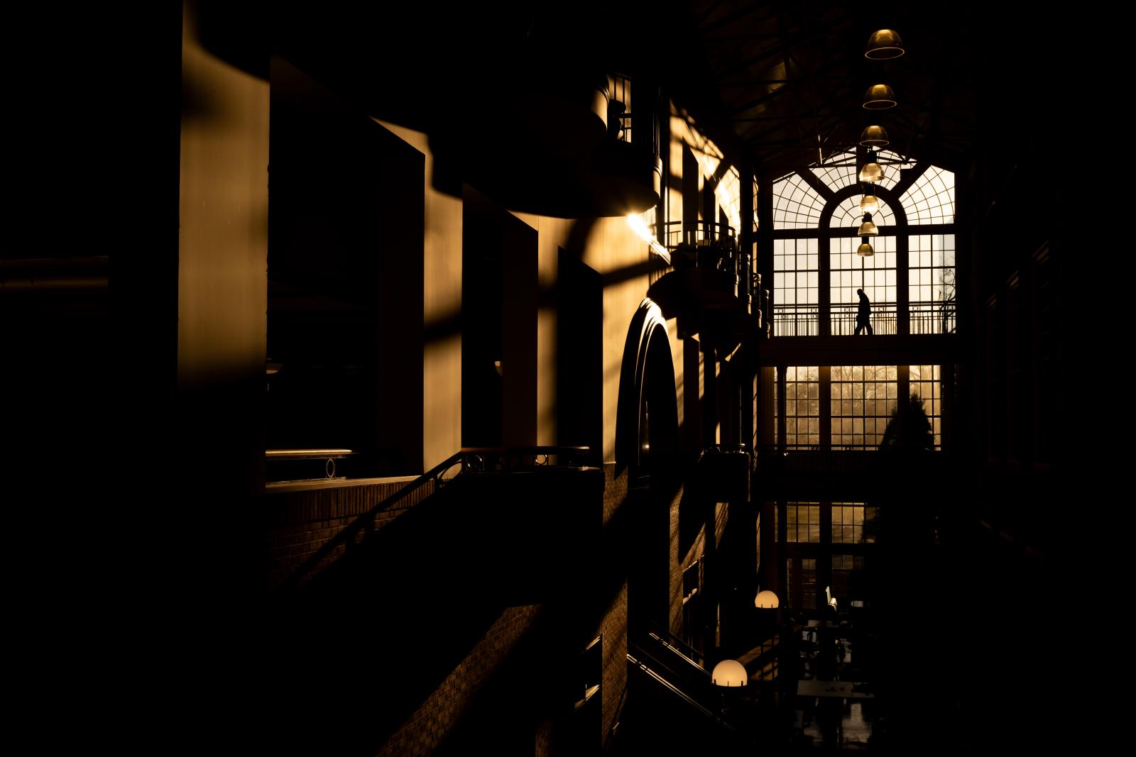 A students walk across the bridge at the library as the golden hour sunset shines through the atrium.