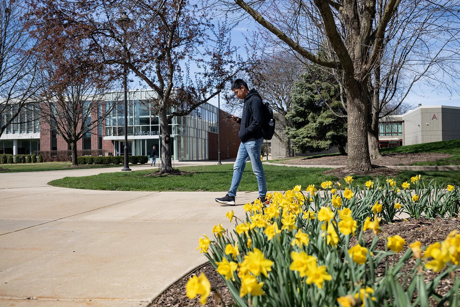Student walking to class on a beautiful Spring day, after multiple days of rainy cold weather.
