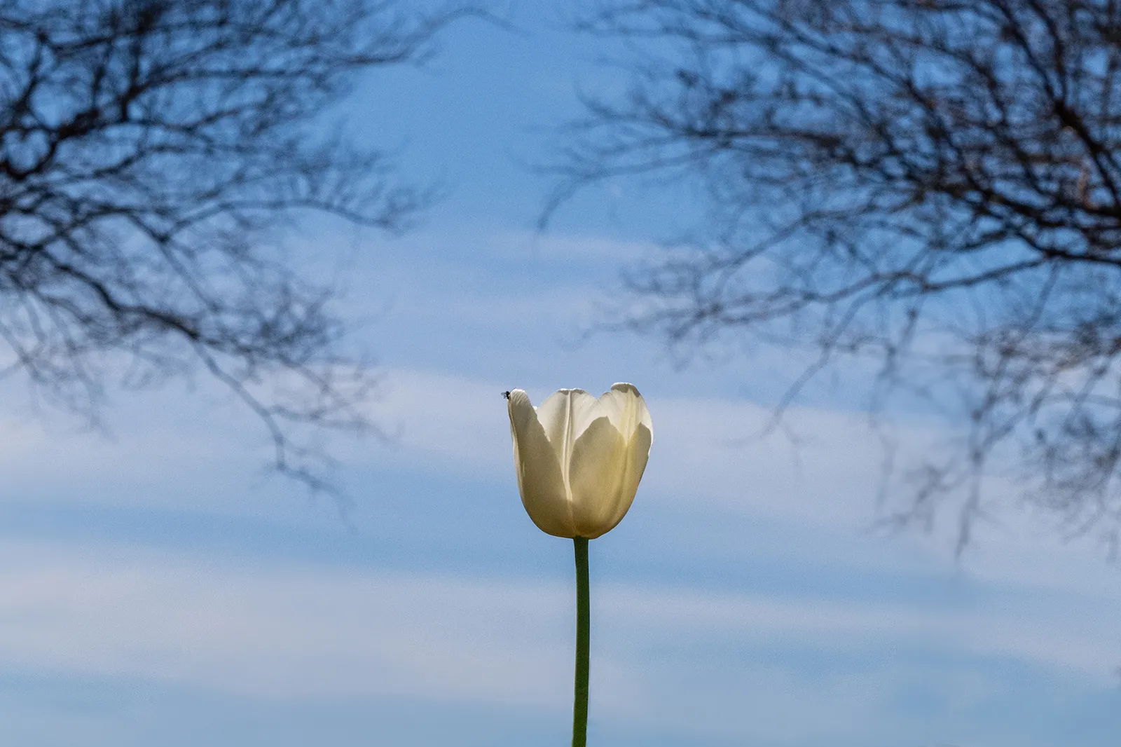 A tulip reaches for the sun among bare trees on an early spring day.