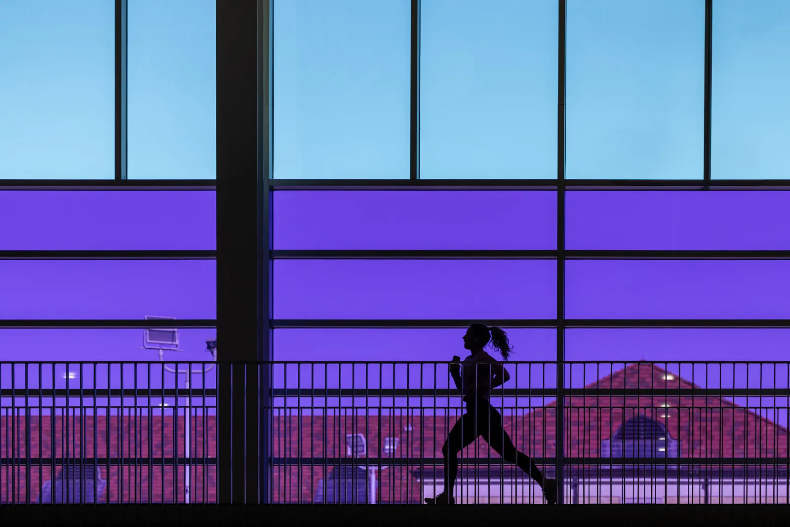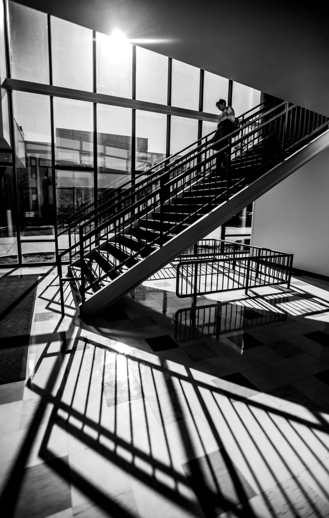 A person makes their way down the stairs of Au Sable Hall on February 5.