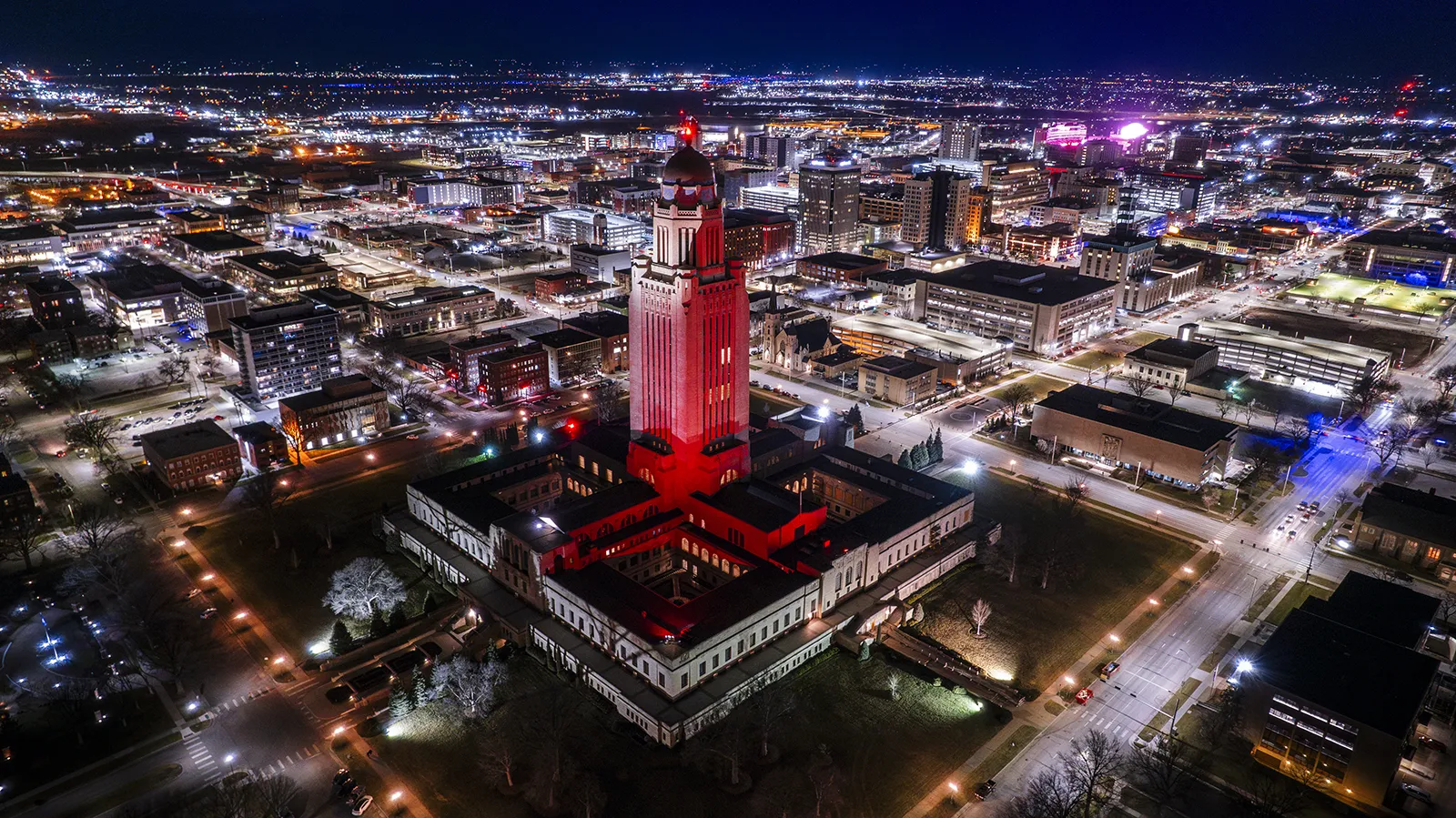 The Nebraska state capitol glows red along with several campus buildings and Memorial Stadium in the upper right during our annual "Glow Big Red" ( a word play on our Go Big Red sports yell) NU Foundation fund raising day.