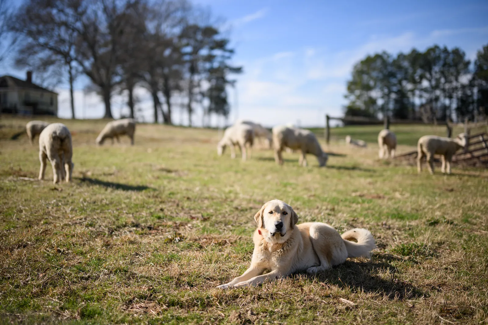 A sheepdog keeps watch over a flock of sheep at the small ruminant education unit.