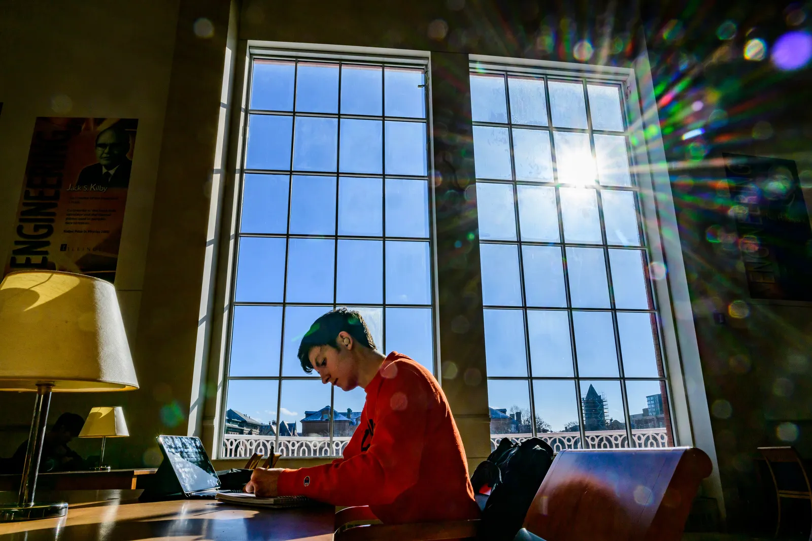A winter sun lights up a study room as a student begins the first day of classes with an online class session.