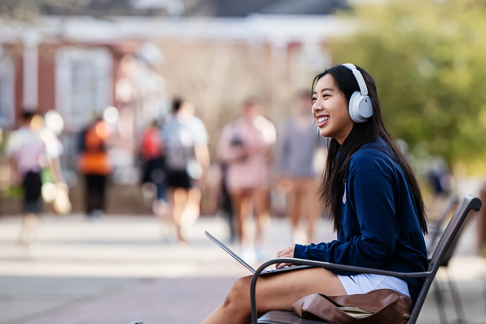 A student talks on a video call with her friend late in the afternoon on Thach Concourse.