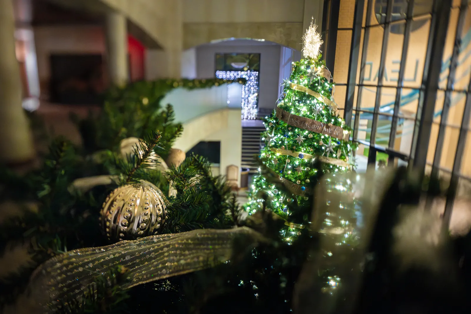 I use an older tilt/shift lens to create a multi-subject scene where the foreground Christmas ornament, as well as the background Christmas tree, are both in focus and complement each other well.