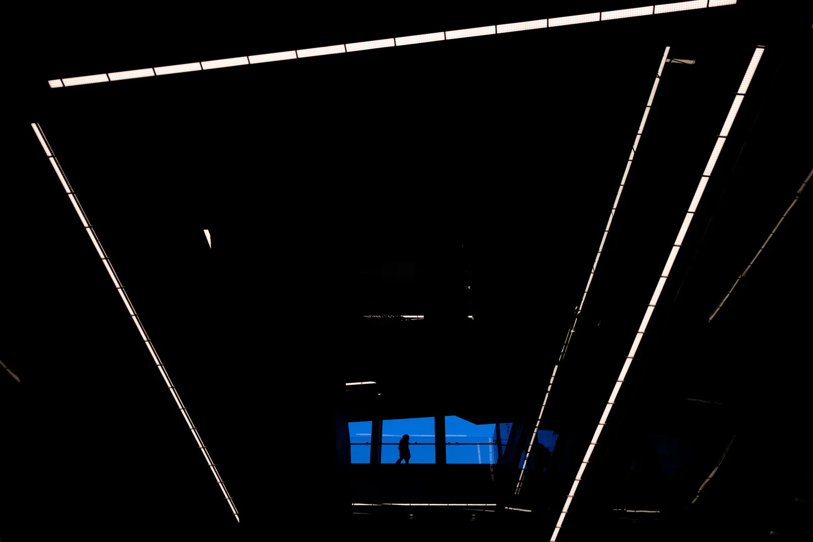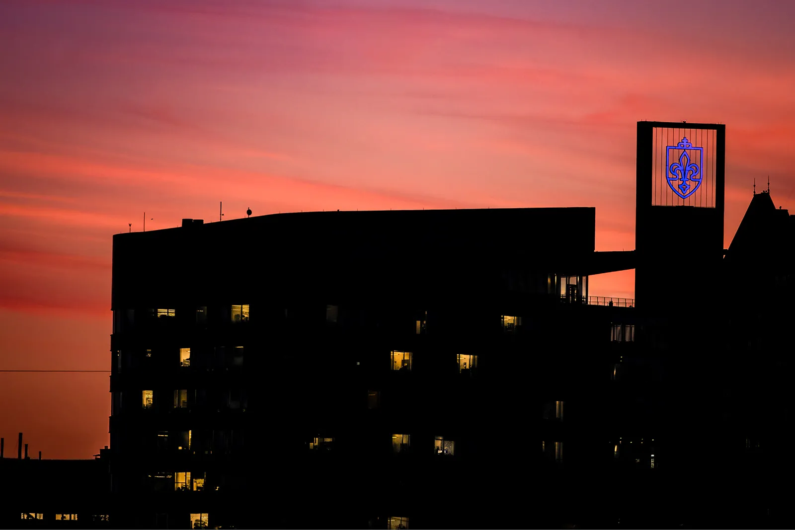 The sun sets behind the Doisy Research Center on December 13, 2023.