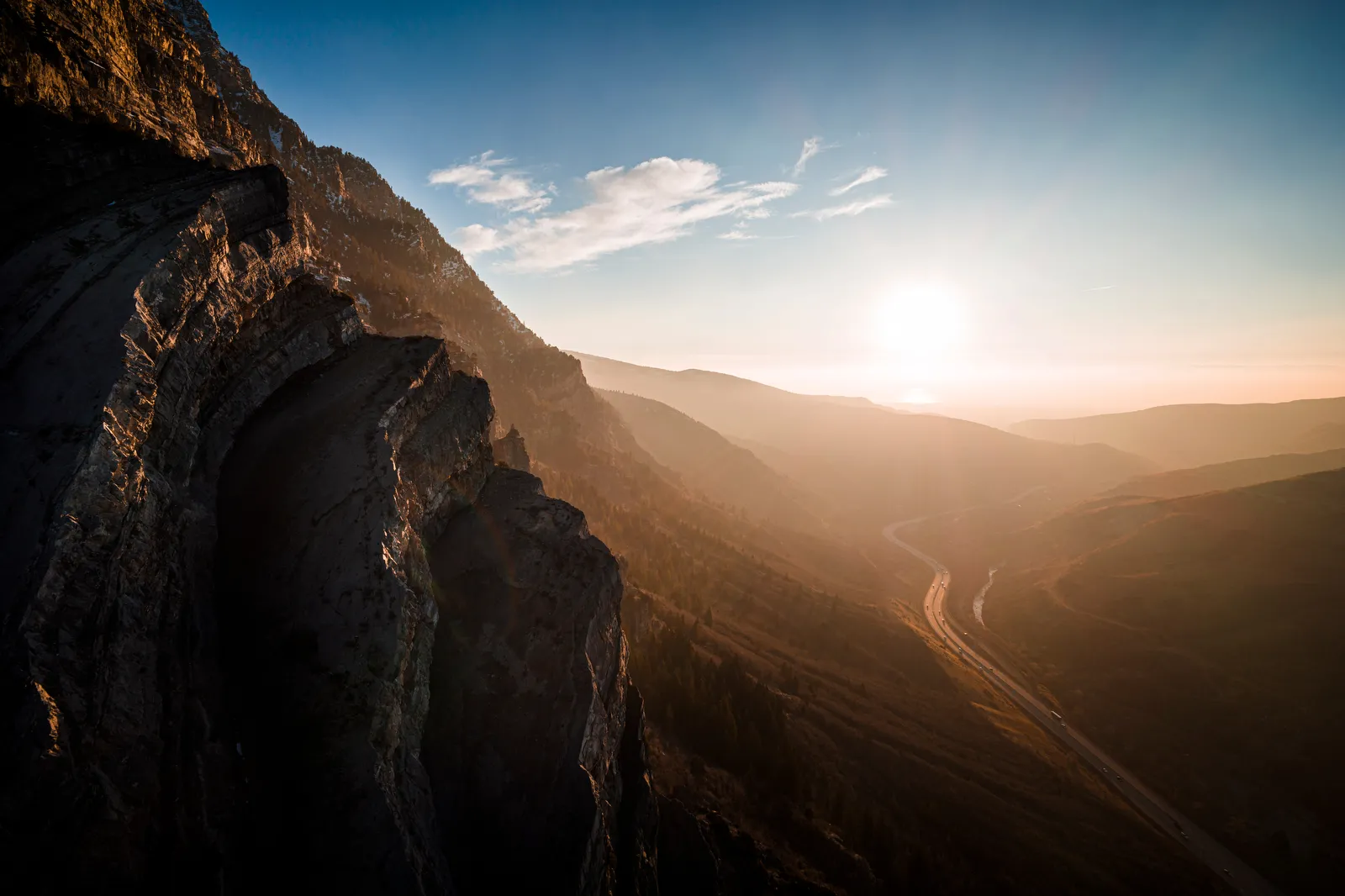 Aerial shot close to the mouth of the canyon in Utah Valley on the way to campus during sunset
