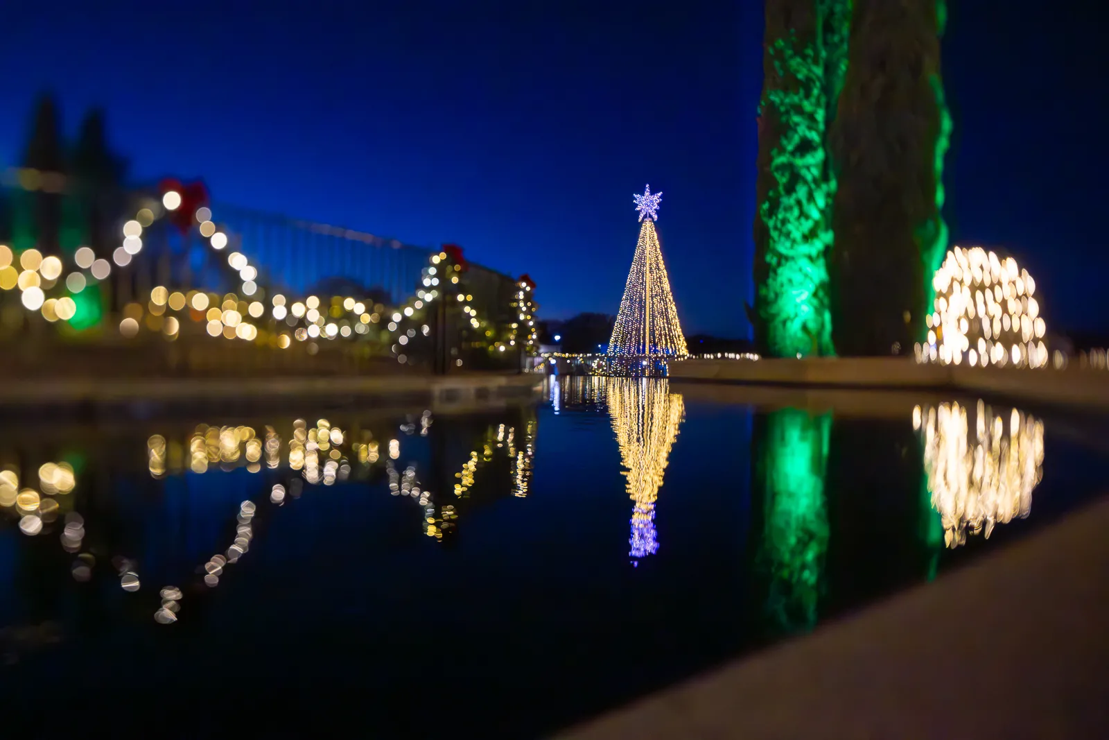 I use an older tilt/shift lens to create out-of-focus elements that create bokeh and direct your eye towards the Christmas light tree.