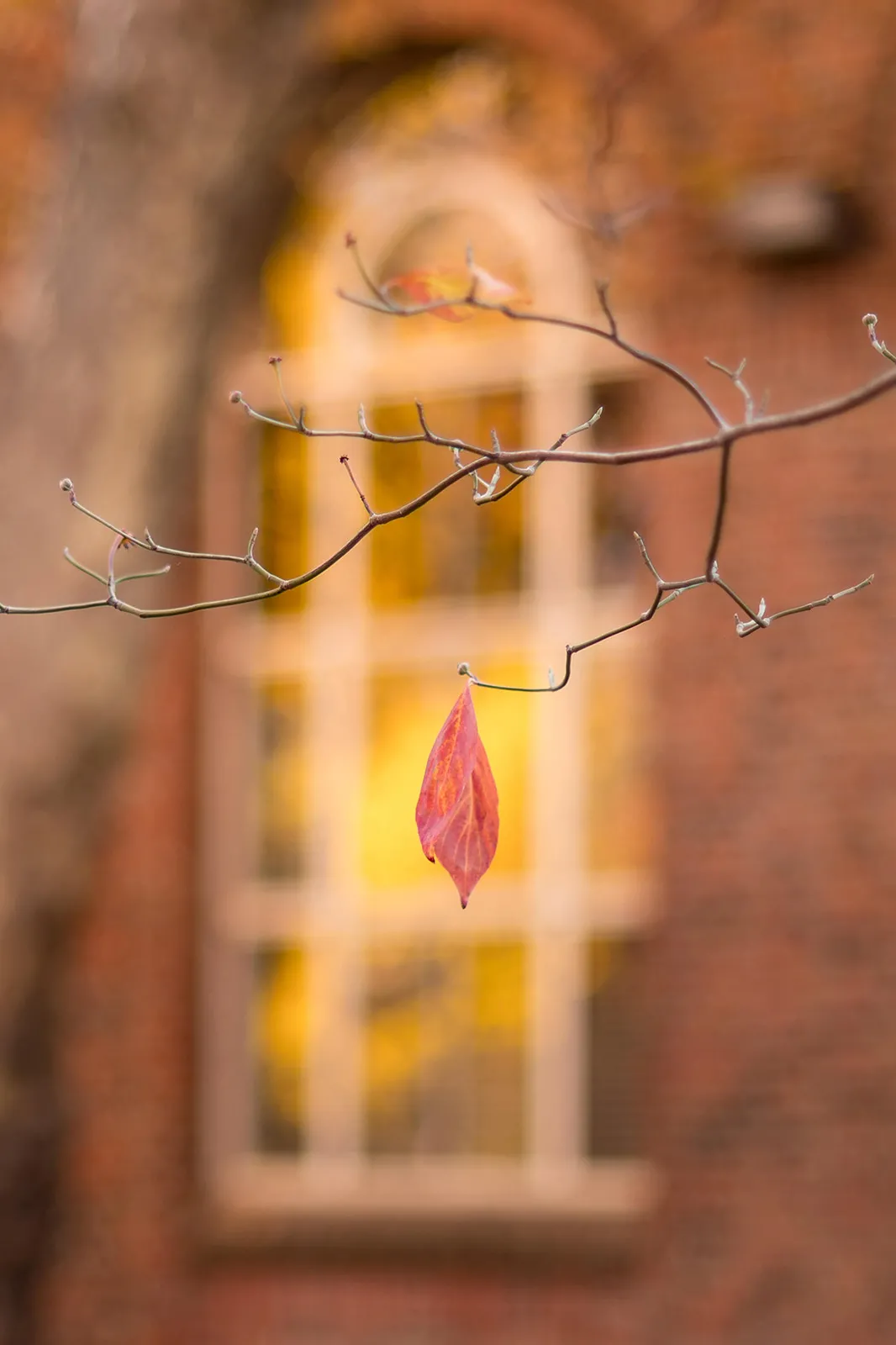 Leaves hang from a branch framed in the window of Trinity Hall on Monday, December 4, 2023.