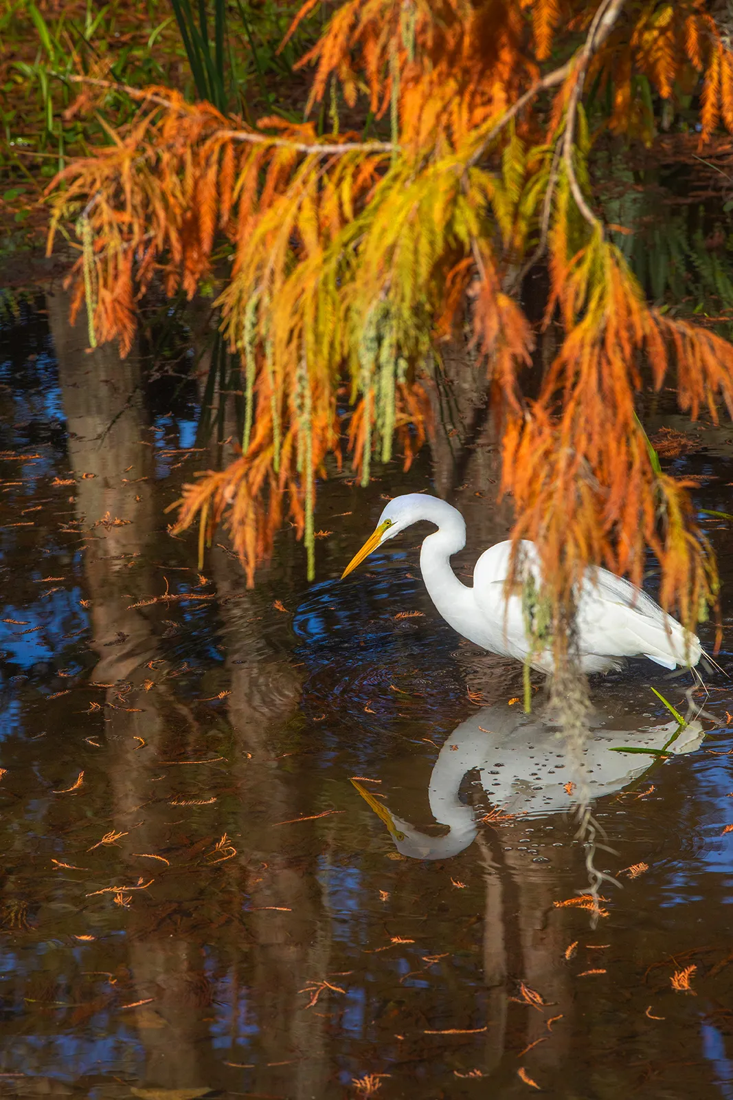 Fall is a beautiful time to photograph the university's Cypress Lake. This egret cooperated for a great shot under the autumn foliage.