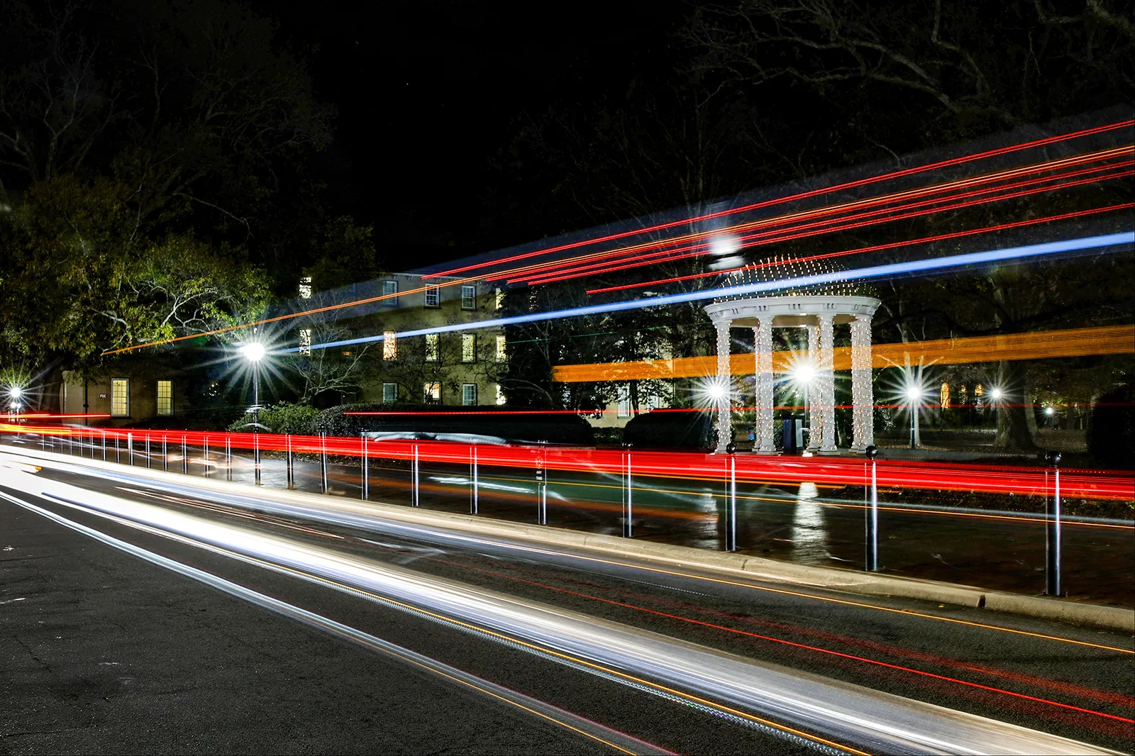 The Old Well is adorned with holiday lights during a long exposure image made on the evening of November 28, 2023, on the campus of the University of North Carolina at Chapel Hill.